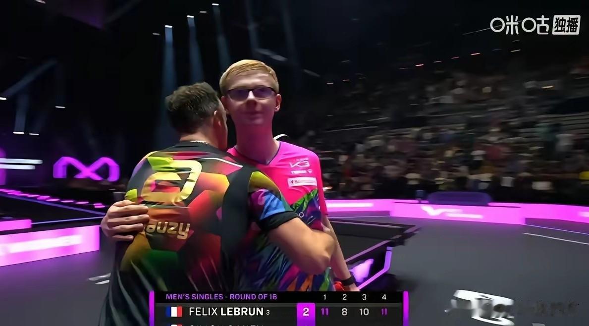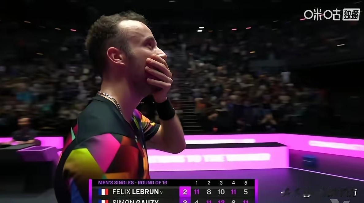 WTT蒙彼利埃冠军赛1/8决赛一场法国队的德比战,小勒布伦苦战五局被队友西蒙·高茨逆转击败,获胜的高茨激动不已,而无缘八强的小勒布伦显得无比失落。