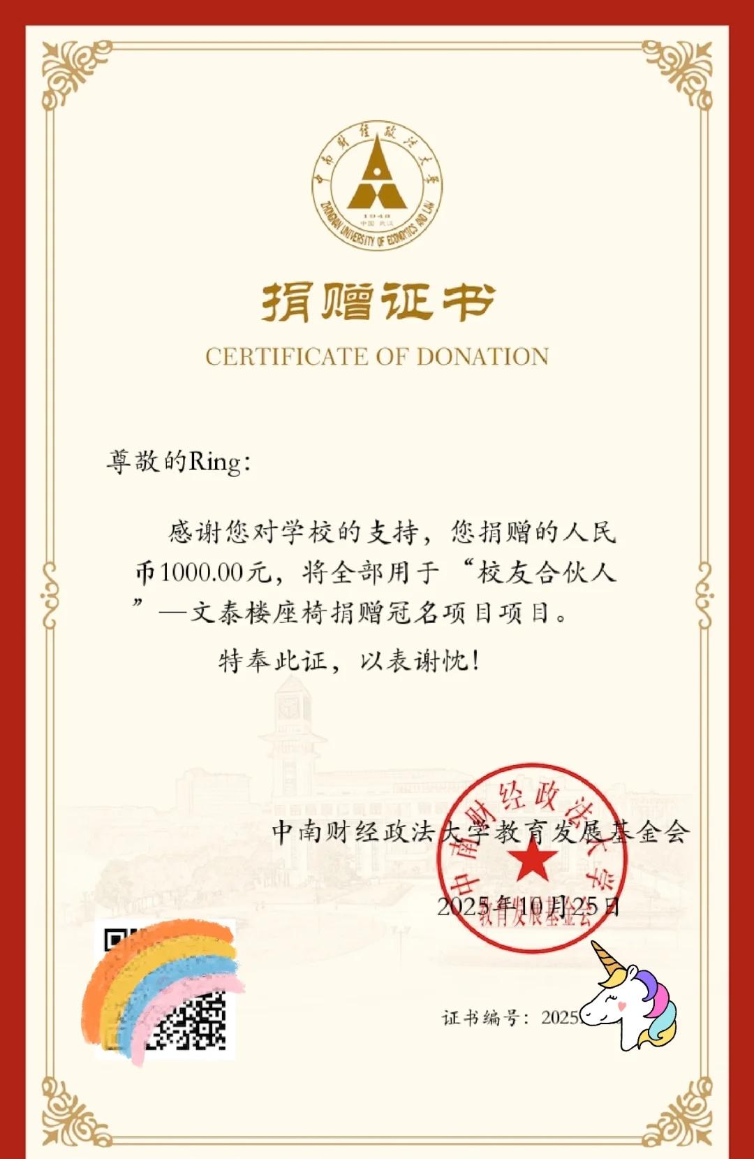 10520,在梦想开始的地方占个座! 今早看到校友总会的推送,咔咔一顿填然后提交,这流程比抢主任号和付尾款还顺还稳还上头 2009-2019,每个转折点都叫嚣着要滚蛋,万万没想到最后居然待够够十年,太多人太多事都很值得提及 但作为外法“黄埔一期”在南湖边上的最后撤离者,既然母校给机会,还是代表班级在文泰嗷一回口号 祝愿母校越来越好,希望明年回去可以看到小牌子 中南财经政法大学 zuel 中南大 中南财