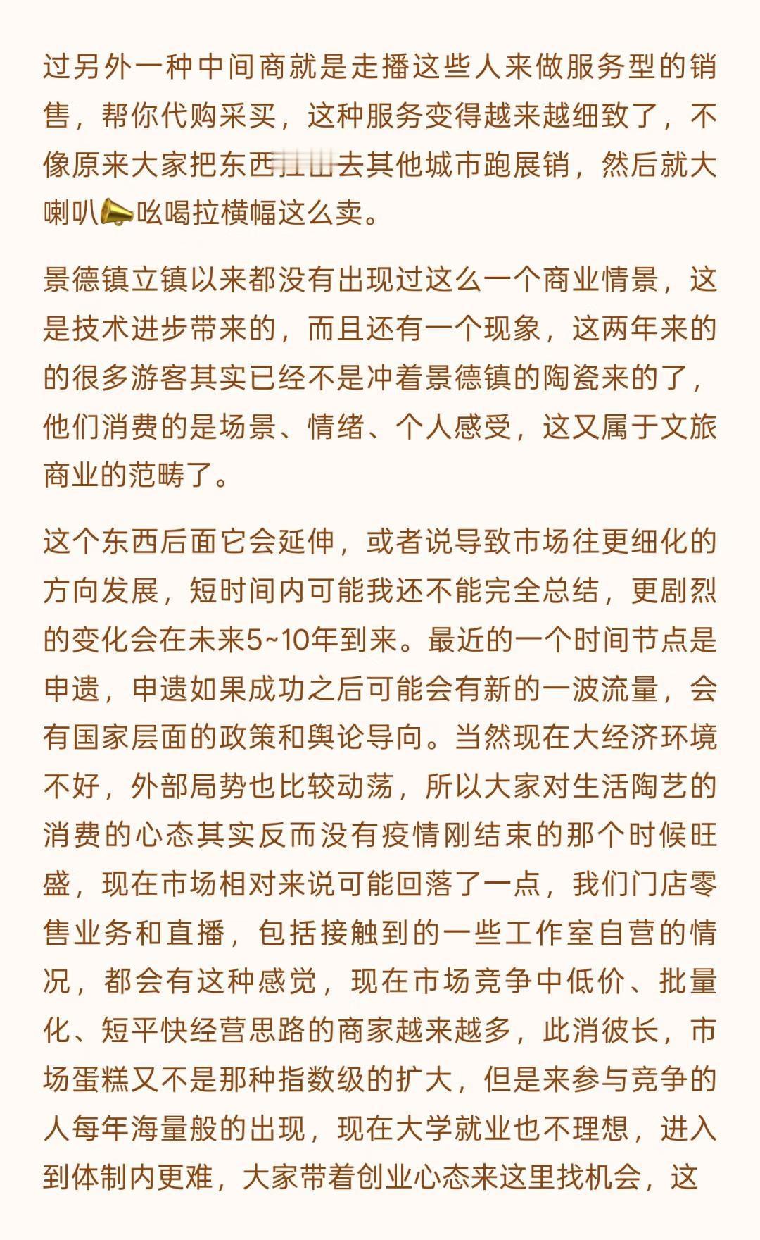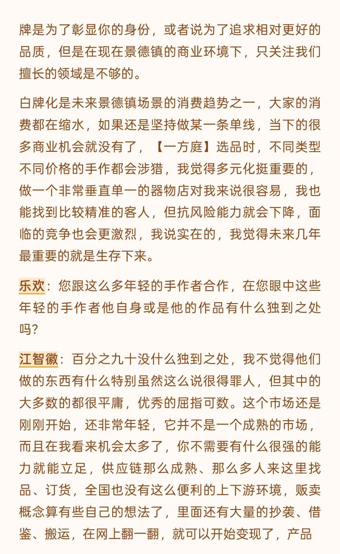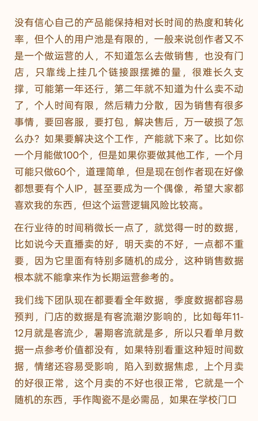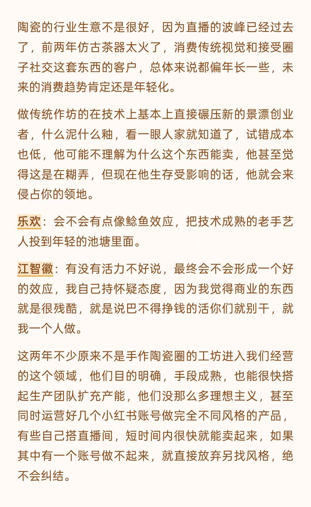 景德镇的变化是历史级别的(上) 文字是数月前和一位陶大博士生的问答式聊天录音整理,磨磨蹭蹭改了好些天,里面有一些暴论吧,但基本是我真实观察后的想法,当然很多尖锐的观点我不会写出来。 这一年来,行业的变化、城市的变化,包括我心态的变化都很大,作为一个经营在地品牌的本地人,适应环境变化是我目前最重要的工作之一。 没有什么比生存更是一个直接的问题,无论是个人还是一个团队,其实我有很多想写的东西,比如: 社交媒体在摧毁创作作者心态,个体潜能被算法镇压,数据大于创作、大于不确定性,生命感消失,设计和表达成为计算,平台流量决定了创作思路和方向。 创作本该是走走停停,甚至不是一条线性的路。但对于有人气的作者来说,所谓的风格成为枷锁,他们接受不了改变带来的后果。 行业材料商和基础设施提供者对于技术的研究比创作者更精进,看材料品牌的电商数据和店铺主推是了解时下流行趋势的直接窗口,如果材料商们下场生产链接客户,个体创作者的机会会越来越小。 … 不展开说了,这些只是团队内部的讨论时的一些碎碎念而已,下个月初我们管理团队会前往益子、东京和京都,看看商业,逛逛美术馆、找找品,也许会找到一些日本买手的合作,多看看小伙伴们总会有感触和自我迭代的,算是给内部的学习投资吧。 如果意识到变化到来,提升自己应对,是我自己的方法,对,把自己作为方法,也可以这么理解。 小蕾的一方庭 景德镇旅行 景德镇手作 景德镇探店 景德镇雕塑瓷厂 景德镇攻略 景德镇打卡 手作陶瓷 陶艺家手作