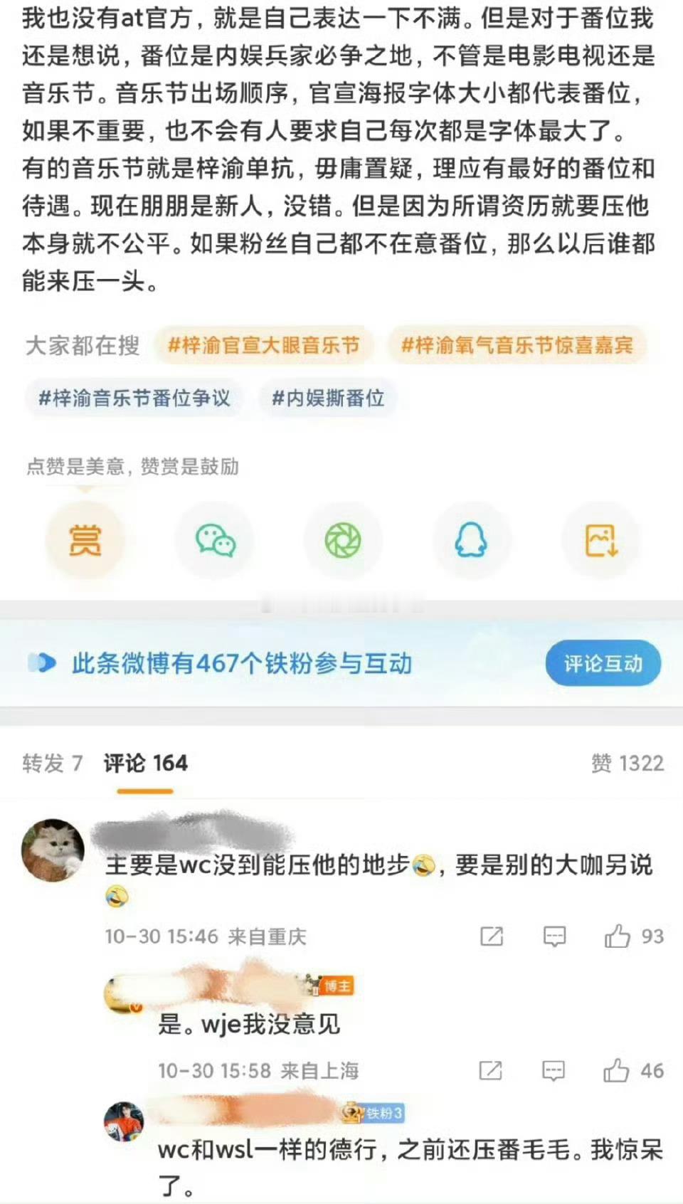 梓渝粉丝因为音乐节魏晨番位写在了梓渝前面,在探讨争取中,你们觉得论咖位谁应该在前