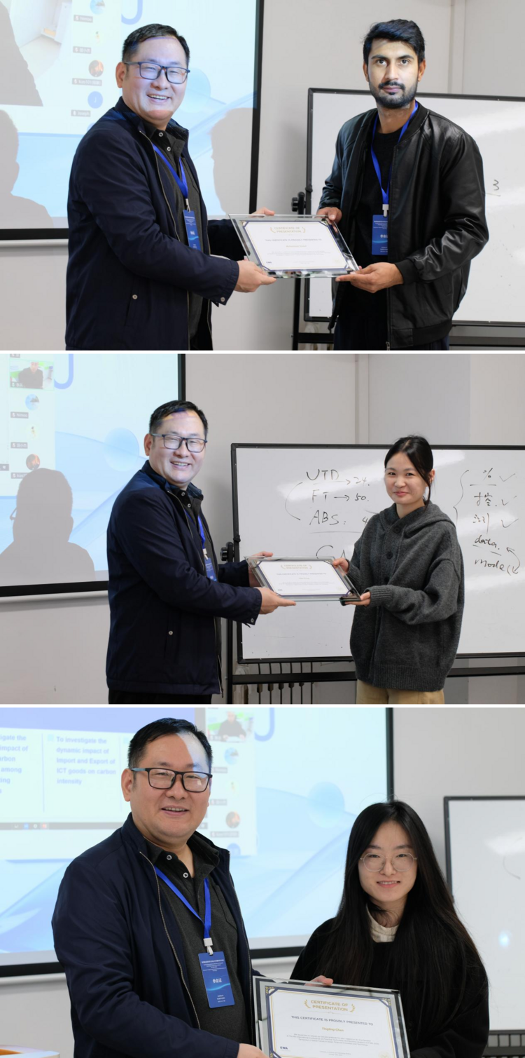 演讲与互动环节结束后,会议进入颁奖典礼环节。孙华平教授为本次所有登台演讲的学者逐一颁发演讲证书,以表彰他们在会议中的精彩分享与学术贡献。证书颁发过程中,现场掌声不断,既是对学者研究成果的肯定,也为本次学术交流增添了庄重而温馨的氛围。