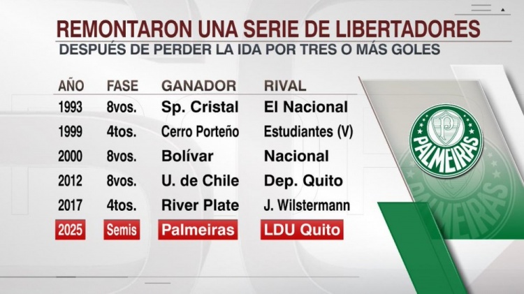 据ESPN统计,首回合净负三球或更多,次回合逆转晋级,南美解放者杯历史上第6次出现这样的情况,上一次是2017年河床在1/4决赛中逆转乔治维尔斯特尔曼。