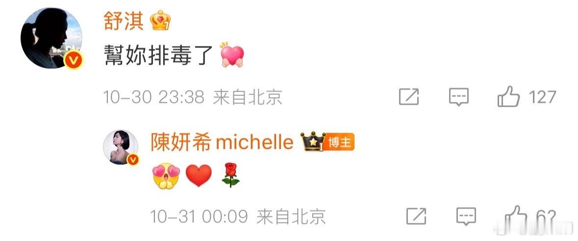 陈妍希说看舒淇导演电影一直哭舒淇说帮陈妍希排毒了陈妍希看舒淇导演的电影直接泪洒现场,舒淇调侃回复帮她排毒,这互动也太有爱了,我先冲为敬!