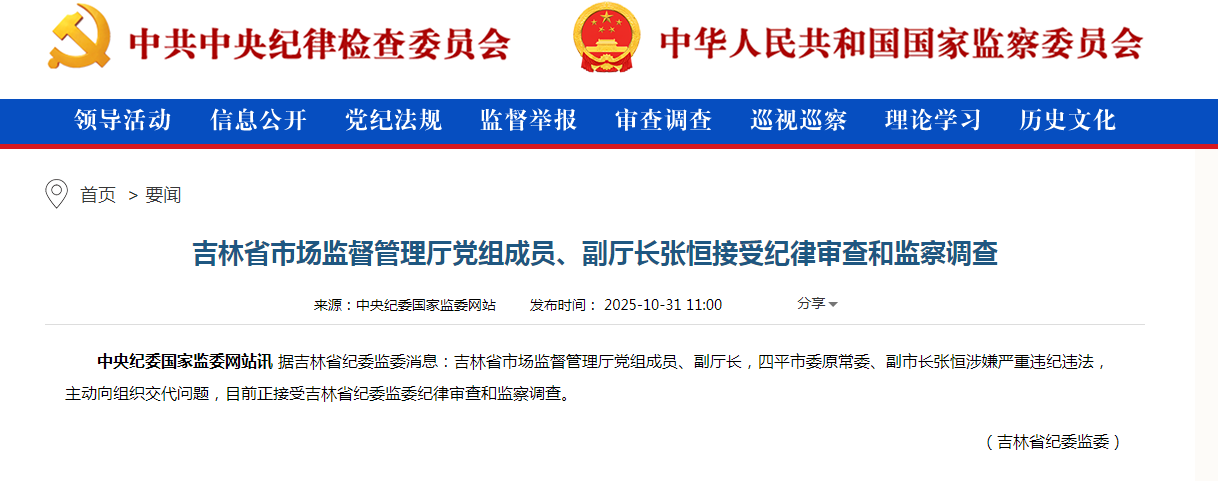 中央纪委国家监委网站讯据吉林省纪委监委消息:吉林省市场监督管理厅党组成员、副厅长,四平市委原常委、副市长张恒涉嫌严重违纪违法,主动向组织交代问题,目前正接受吉林省纪委监委纪律审查和监察调查。