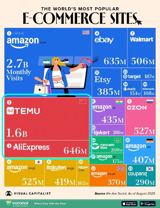 据悉,该排名数据来自WeAreSocial机构,统计的是2025年6-8月期间的月平均访问量。其中亚马逊以27亿次的月访问量占据榜首,中国跨境电商平台Temu和速卖通分列二、三位。