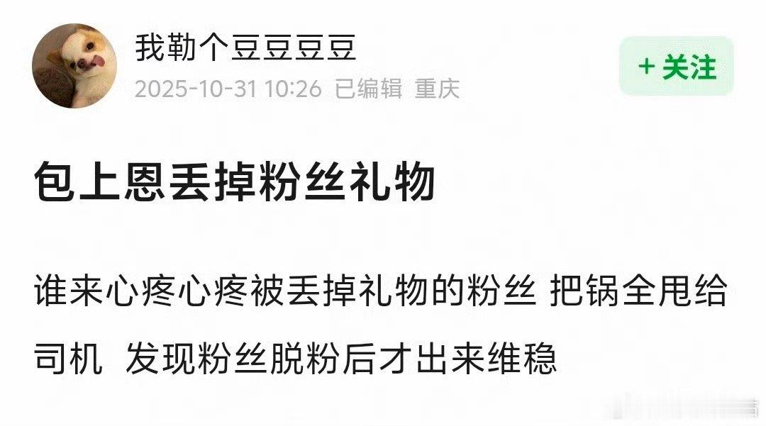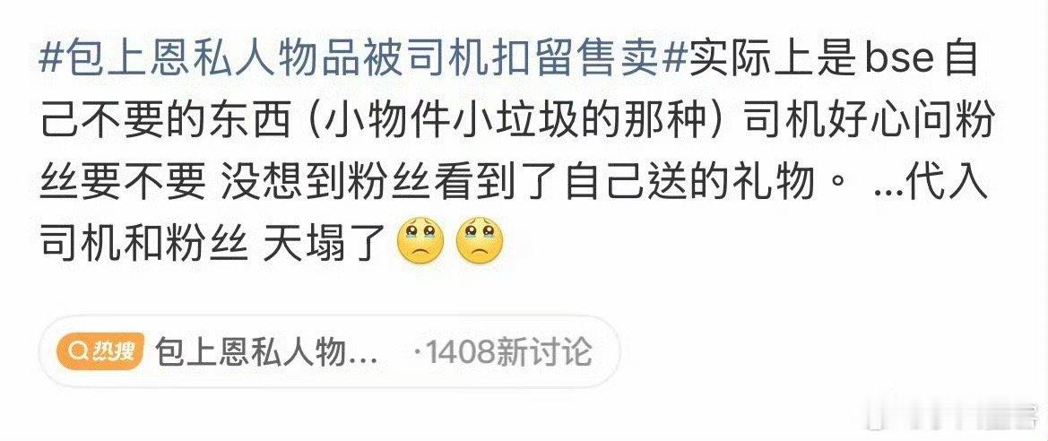包上恩私人物品被司机扣留售卖 包上恩的事件好像另有隐情,疑似是自己丢掉粉丝礼物被发现之后还甩锅给司机,如果是真被偷了,现在出示的应该是报👮🏻♀️通知单,而不是道歉信,包上恩团队有点恶心了,208就这样欺负打工人[吐]