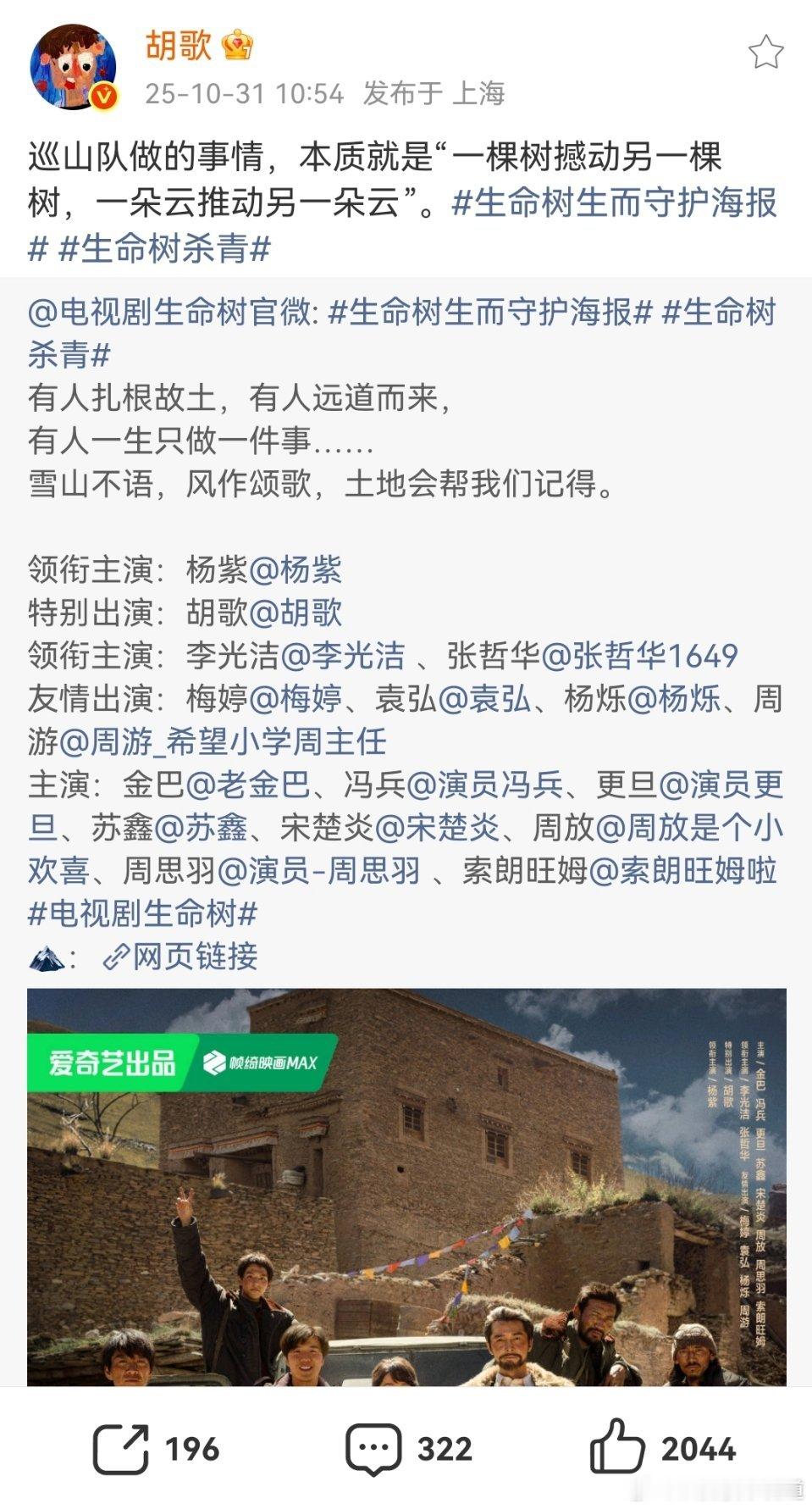 杨紫胡歌生命树最新海报生命树杀青,每个人的文案都透着一种厚重感。生命树杀青