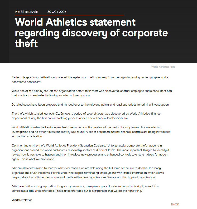 对此,世界田径联合会主席塞巴斯蒂安-科表示:“令人遗憾的是,企业盗窃事件在全球各地的组织机构中屡见不鲜,且横跨各行各业、贯穿各个层级。关键在于及时发现、深入剖析其发生根源,并通过引入新流程和强化管控措施确保此类事件不再重演。这是我们正在做的。”