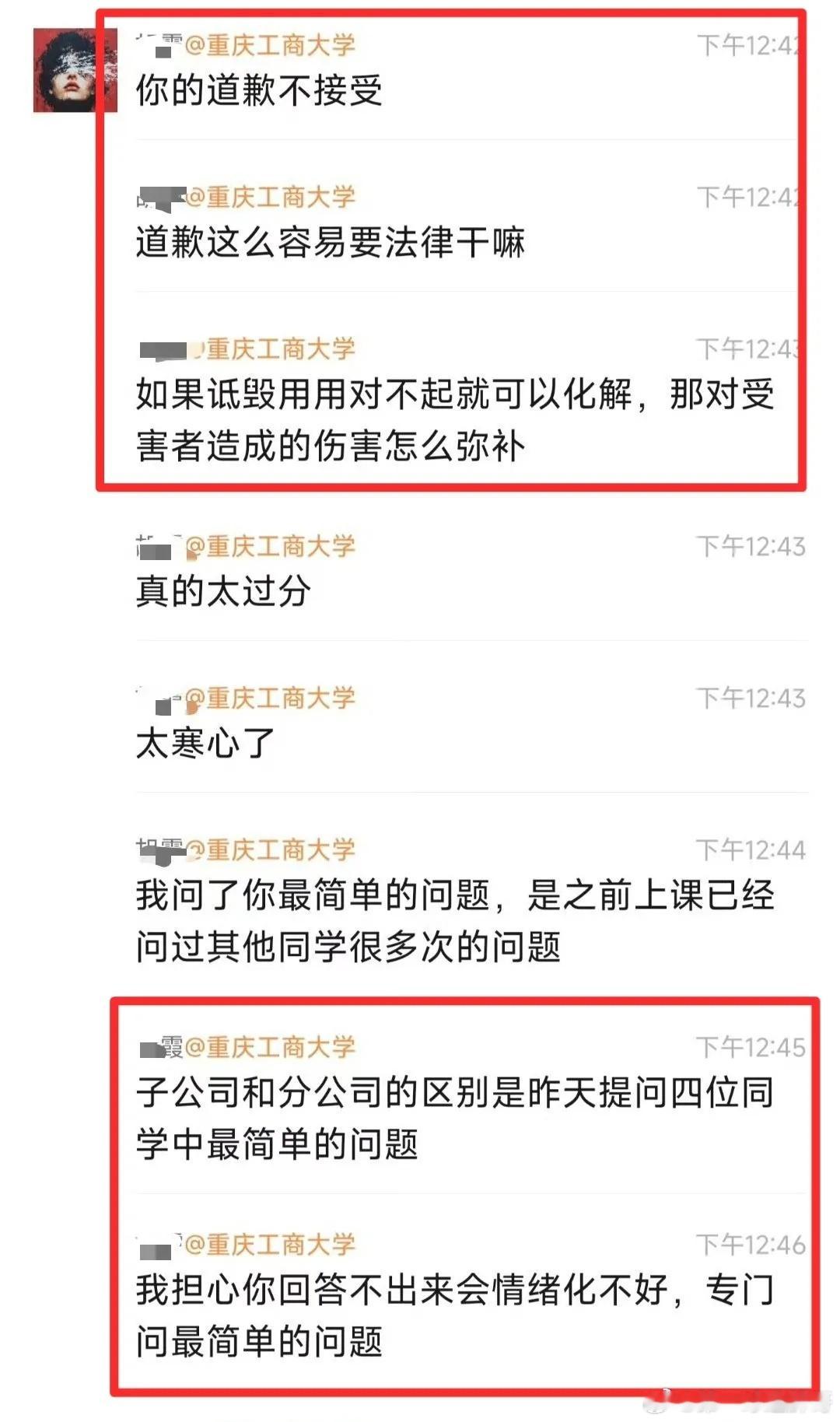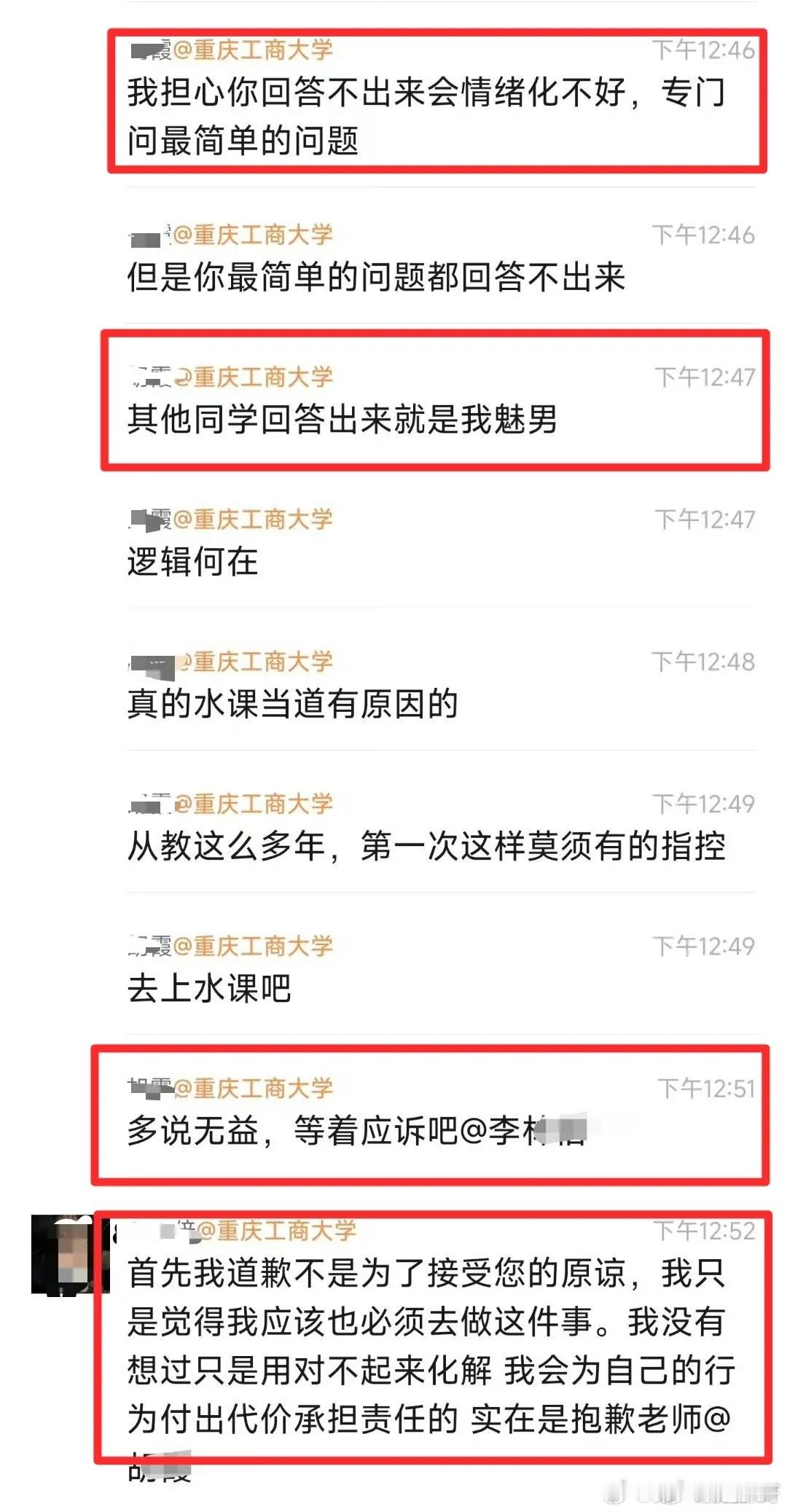 近日,在重庆工商大学就发生了一起让人匪夷所思的事情,一名女生直接将女老师挂到了网上,称该老师刻薄、媚男,消息传到女老师那边后,在群里火力全开,在女生道歉的情况下,仍然要起诉女生,要给女生好好上一课。
