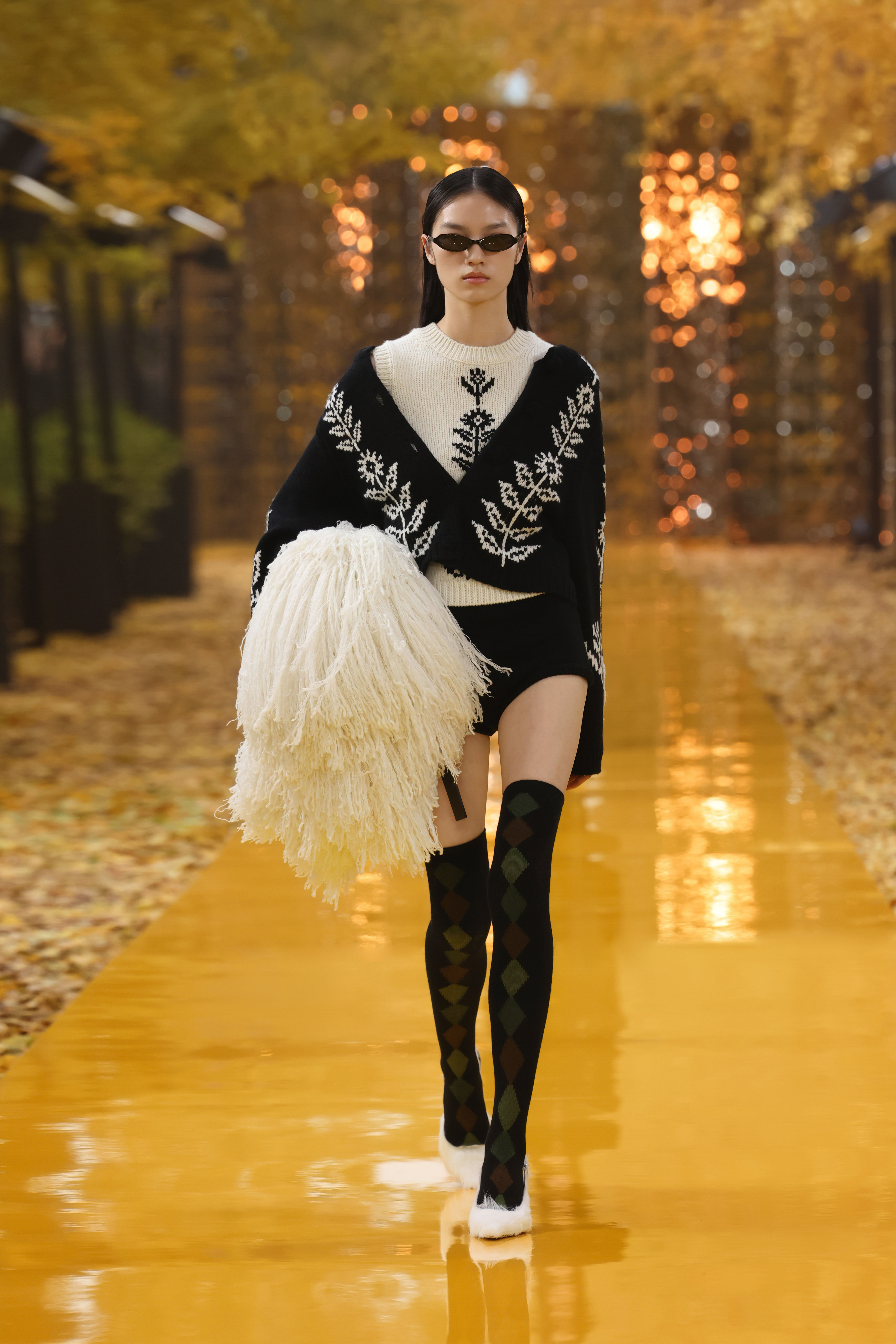 回到创作重心 ,女装系列以「探索材质的可能性」为视角撬动针织工艺的传统印象 ,通过创新与创作赋予这一材质更多的变化可能。冲击力强的几何感廓形成为本季的核心视觉 ,简约的黑白两色铺陈现代风格 ,高饱和度的红色成为亮点 ,跳跃丰满的鲜明图谱辅以复古花型针织 ,曳地针织长裙 、超长款羊绒大衣 ,都市氛围强烈的皮革 Look 包括立体感突出的流苏长裙 ... 建筑般流畅的线性结构之间,一个摩登而又具结构性的女装系列就这样呈现于眼前。