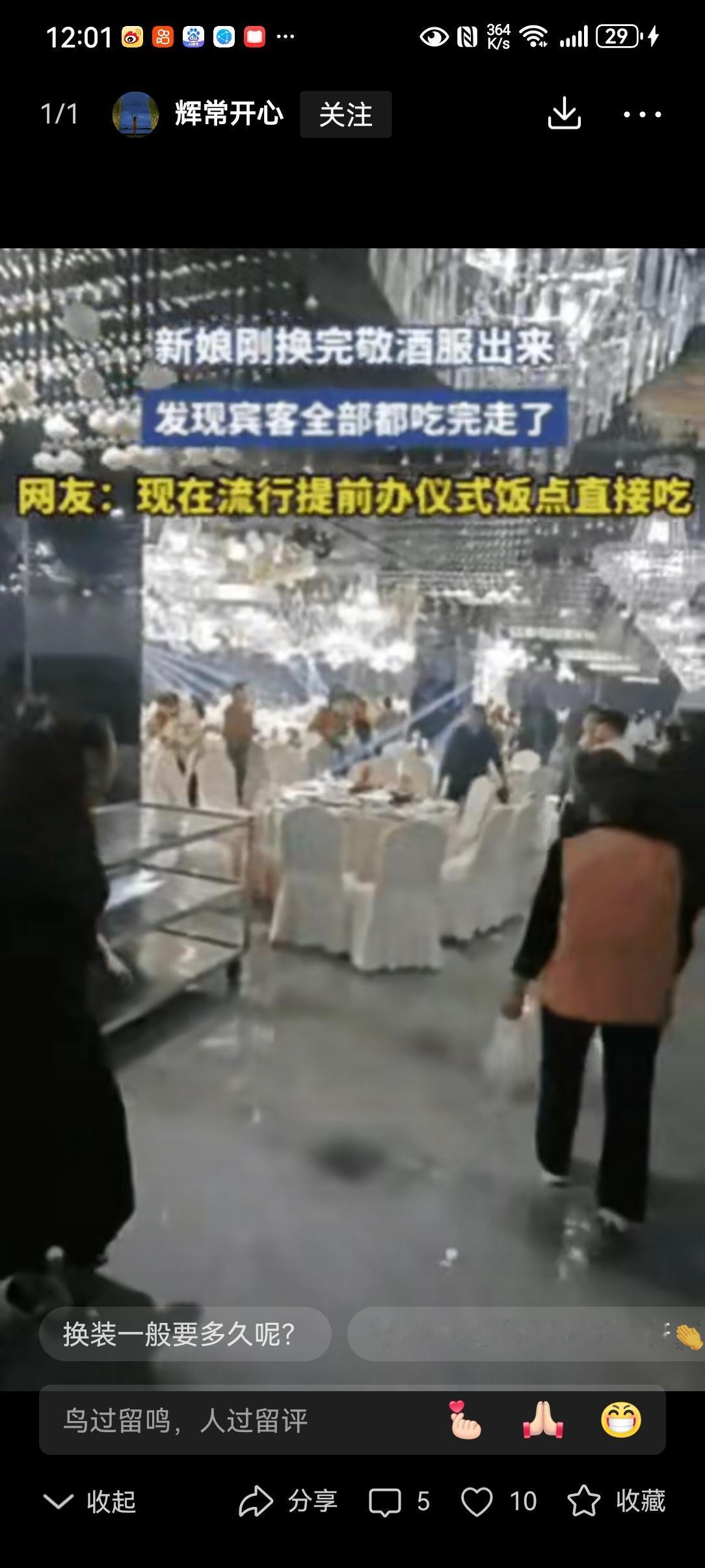 山东,一新人结婚,高朋满座,婚礼仪式结束后,新娘去换了件酒红色的敬酒服,准备出来给亲朋好友们敬酒,可等她换好后出来,却发现宾客们都已经吃完散席走了! 喜宴开席时,满屋子都是道贺的人声,杯盏碰撞声闹得耳根发烫。新人拜完堂,新娘惦记着敬酒的礼数,转身去换早已备好的酒红色礼服。 那衣服是她挑了半个月的,修身剪裁衬得身姿窈窕,裙摆拖在地上沙沙作响,连妆容都特意补了两回,就盼着给亲友们留个体面印象。 她估摸着,换衣补妆再慢,半个时辰也该够了。可等她提着裙摆,笑意盈盈地走出更衣室时,眼前的景象让她愣在原地。 酒桌大多空了,碗碟狼藉地堆着,剩下的寥寥几位,还是自家至亲。那些刚才还热络道贺的宾客,竟已悄无声息地散了席。 新娘脸上的笑僵了瞬,随即又舒展开,对着亲友们摆摆手:“散了就散了,倒省得我挨桌敬酒受累。” 有网友打趣:“现在的喜宴,仪式是配菜,干饭才是主菜,吃完抹嘴走人,谁还等敬酒?” 这话糙,却戳中了实情。新人费劲心思打磨的仪式感,在宾客眼里,或许只是沾沾喜气的由头。 你在乎礼服合不合身,他关心饭菜香不香;你纠结流程完不完整,他惦记着返程的路远不远。成年人的社交,本就带着几分潦草。 新娘的敬酒服没派上用场,说不失落是假的,但也未必是坏事。 婚姻的幸福,从不是靠一场完美的婚礼撑起来的,更不是给旁人看的热闹。那些繁文缛节少了,反而能多些心思看看身边的人。 仪式是给生活的点缀,不是枷锁。与其执着于形式上的圆满,不如守住彼此相守的真心。 日子是过给自己的,不是演给别人看的。你觉得婚礼该讲究仪式感,还是怎么舒心怎么来?