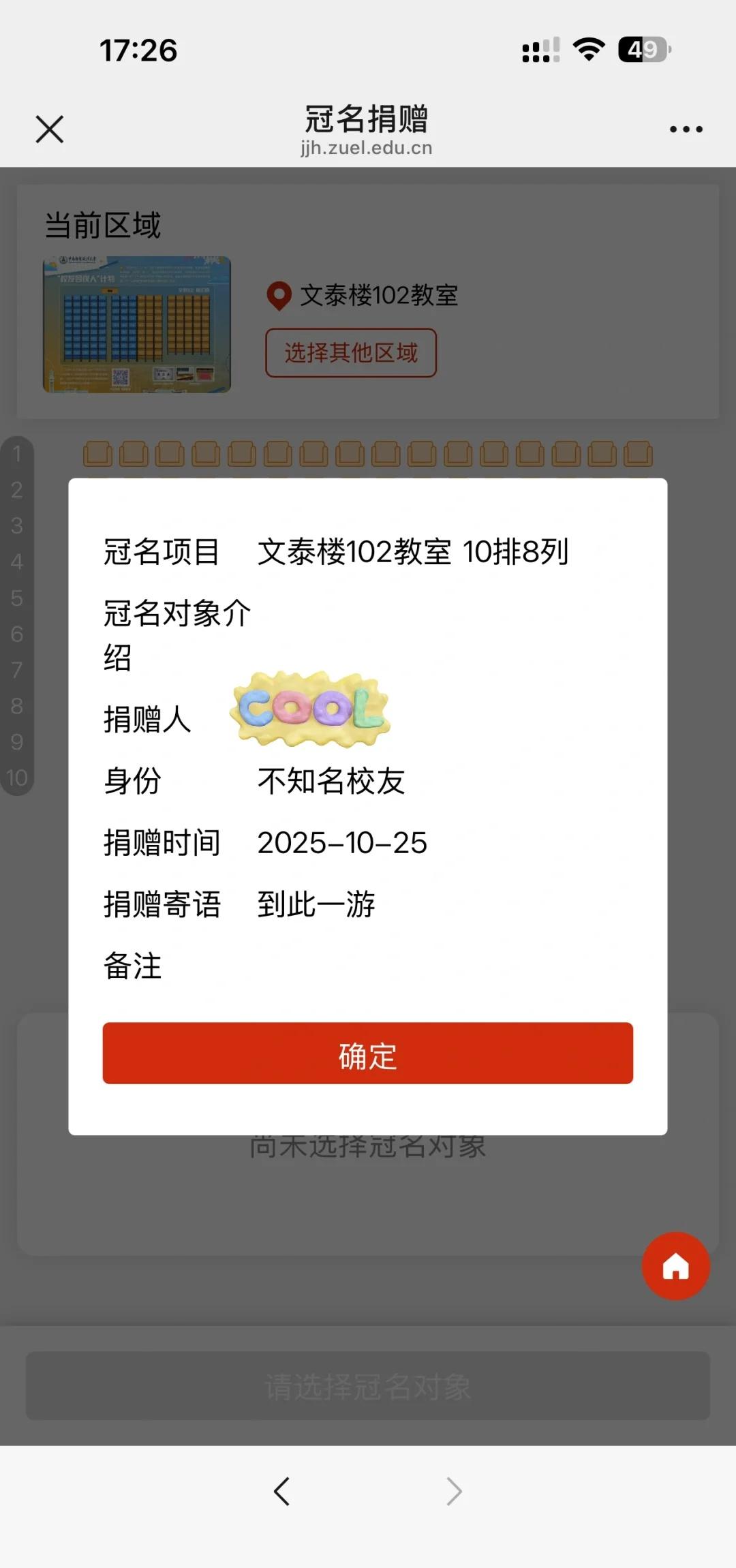 中南财不知名校友认领了一把椅子 我选了最后一排中间的位置 符合我学生时代摸鱼的经历 中南财经政法大学 摸鱼 不知名校友