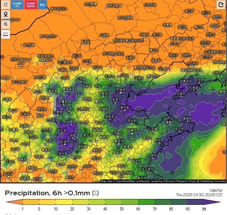 10.30-12:35 今天下午,天津的弱降雨会继续,北京局部可能飘点儿毛毛雨,石家庄有雨的可能性比较小。 京津冀今天下午具体的降水概率可以参考图二。 目前北京的空气质量有所好转,PM2.5差不多降到100+了,并且还在缓慢下降中,气温如此舒适,出门骑会儿车,问题也不大。