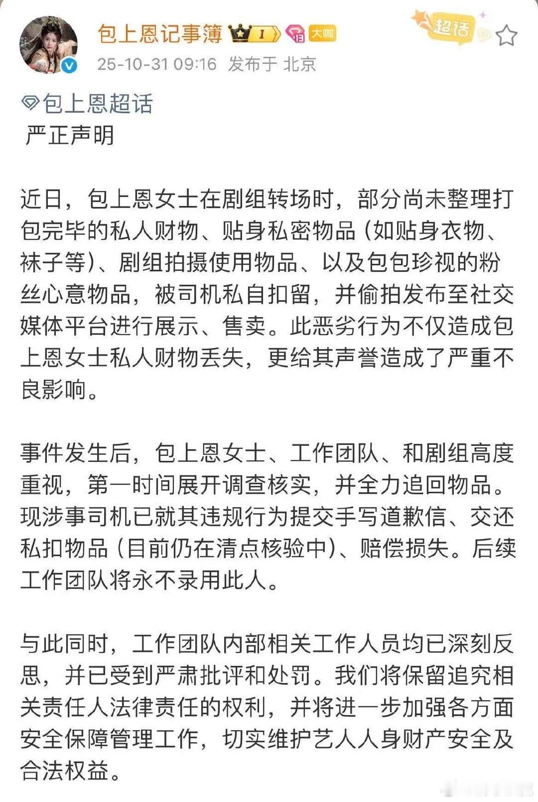 包上恩私人物品被司机扣留售卖 细思极恐!转场时未收的私物被司机偷卖,含贴身衣物等私密物品。行为涉嫌违法,心疼小花,团队管理必须严抓!