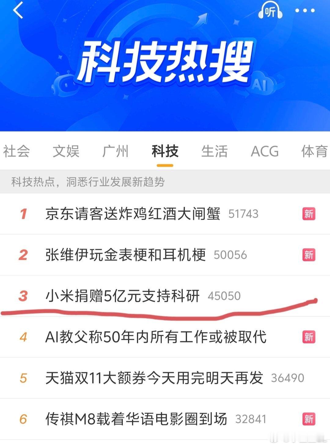 小米捐赠5亿元支持科研这人是看不到吗?这叫热搜没一个吗?捐赠是好事,支持!