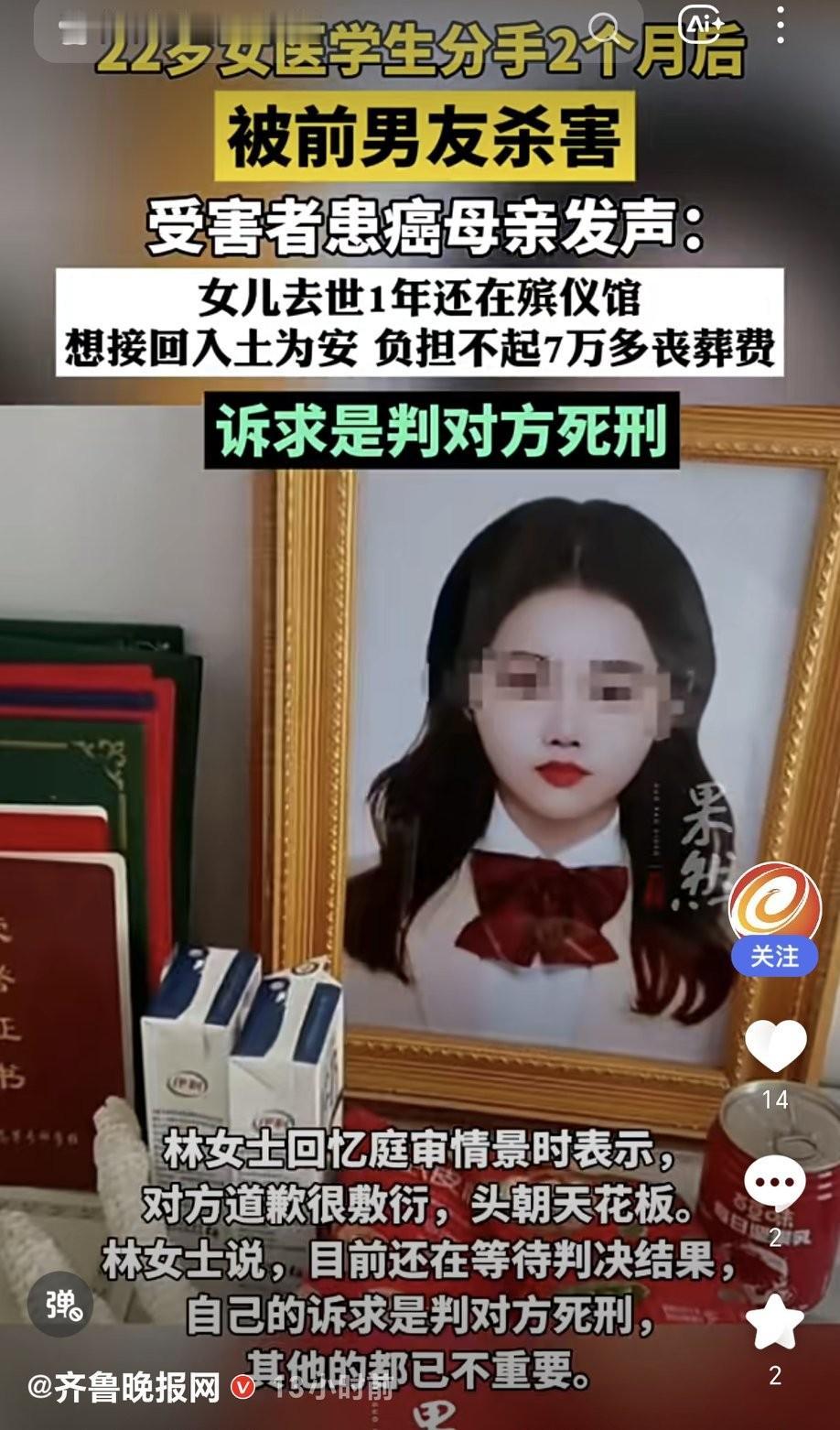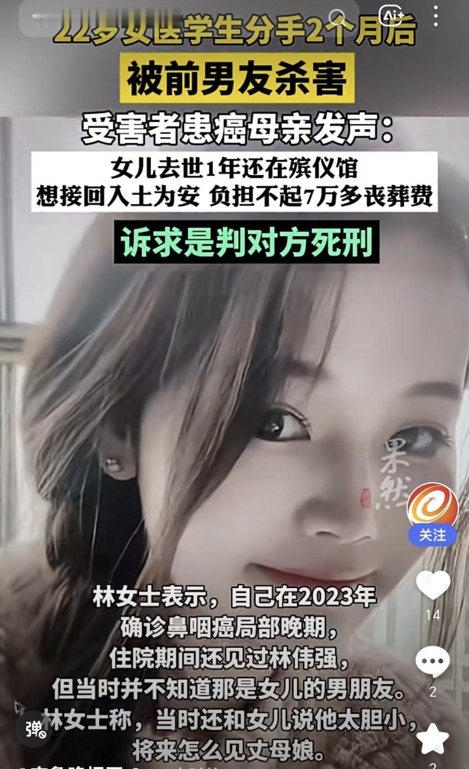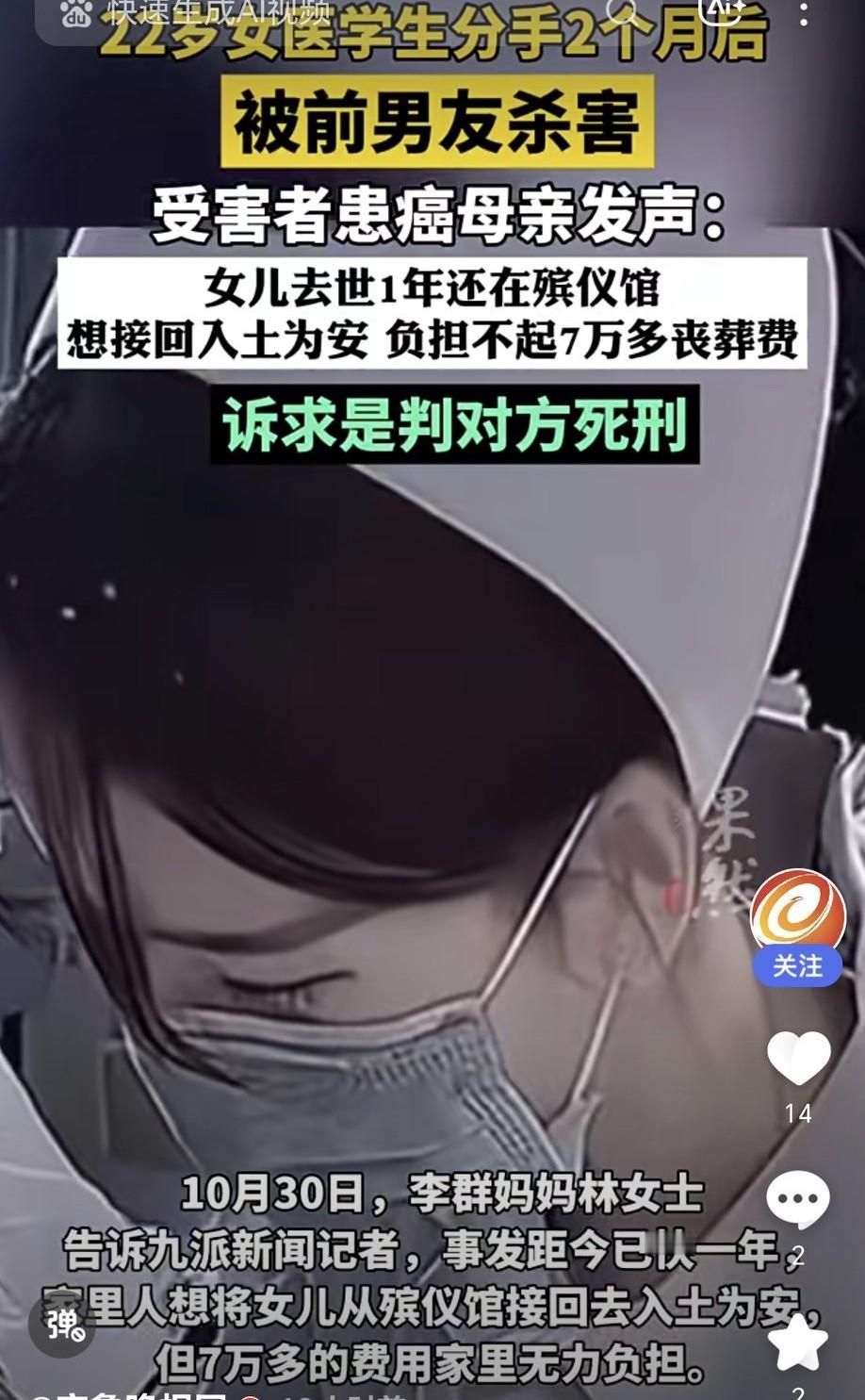交友需谨慎,尤其是男朋友。 22岁女医学生李群和男友分手2个月后,被其杀害。她通过专升本考试进入安徽医科大学护理专业,还努力考研,梦想是当老师。可前男友林伟强太偏激,两人2024年8月底分手,他竟认为李群不忠,买三棱军刺、电击枪等工具,11月1日在出租屋将李群掐死。 李群闺蜜说男方长期靠她养着。李群母亲2023年就确诊癌症,如今女儿遇害,她每天都在等凶手伏法,“我活着的每一天就是等凶手死”,这话听着让人心碎。女儿去世1年还在殡仪馆,母亲想接回入土为安,却负担不起7万多丧葬费,只能诉求判对方死刑。 本就承受着失去亲人的痛苦,还要面对高额费用和手续难题,希望法律严惩凶手,给受害者和家属一个公道,相关部门能重视, 让逝者早日安息。