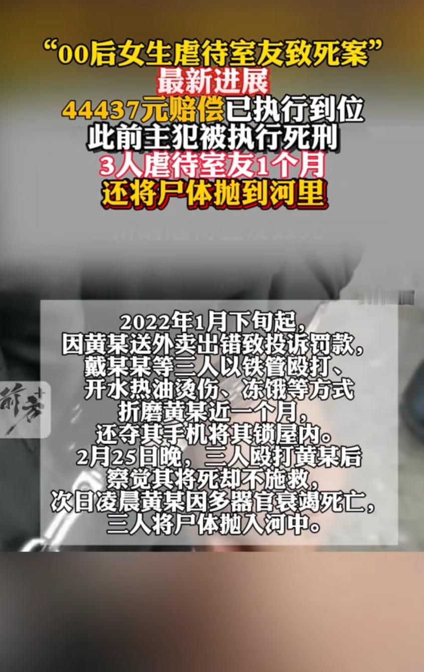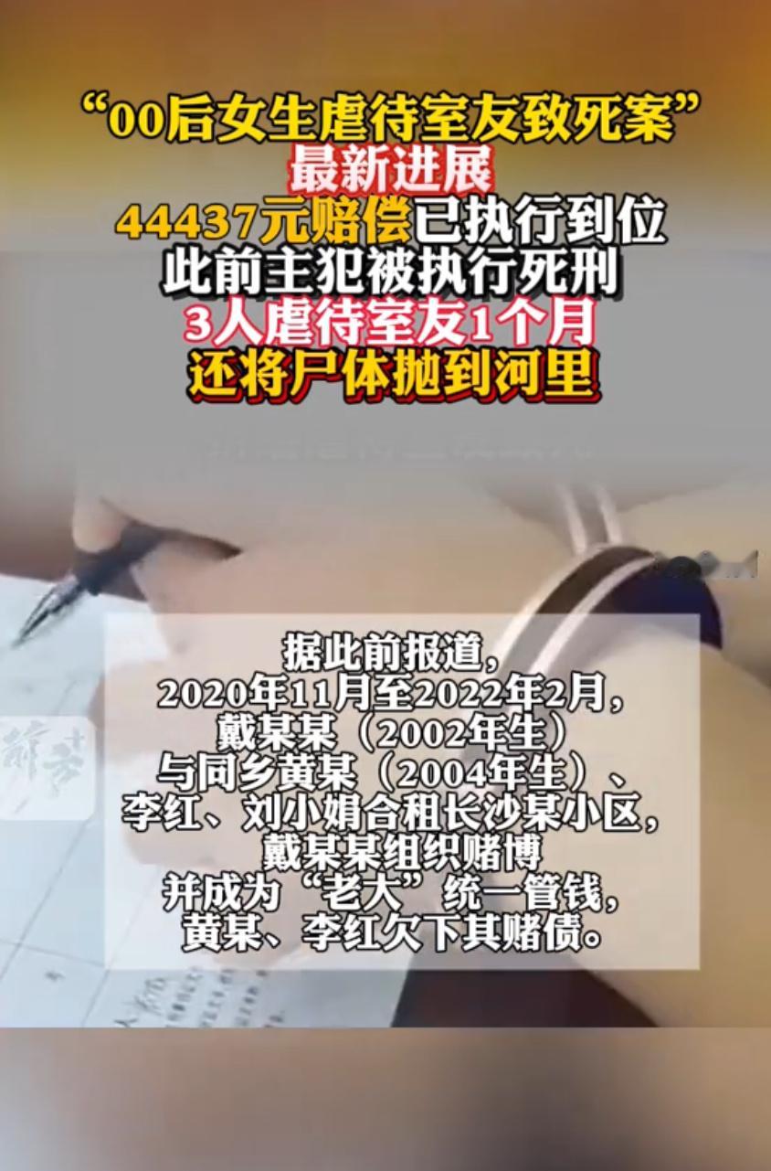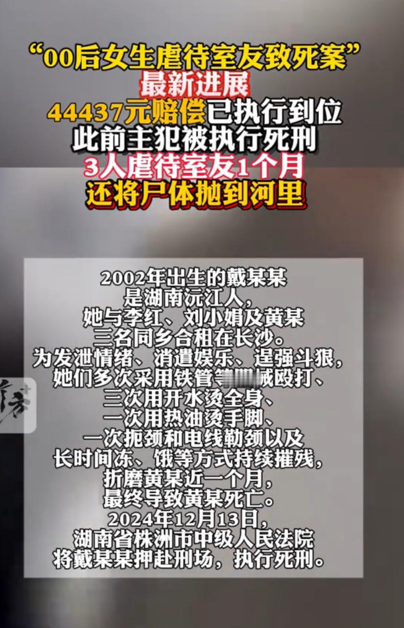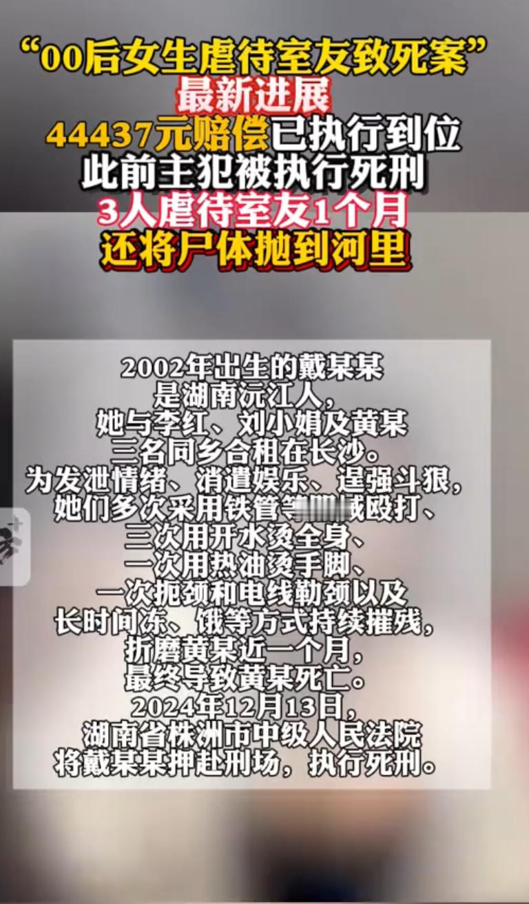 三人虐待室友致死案赔偿已执行2022年,湖南同乡戴小娟等三人在长沙合租期间,因赌债控制+琐事,近一个月内用铁管殴打、开水热油烫伤等方式虐待室友黄某,致其死亡后抛尸湘江。主犯戴小娟2024年被执行死刑,另两人获重刑。