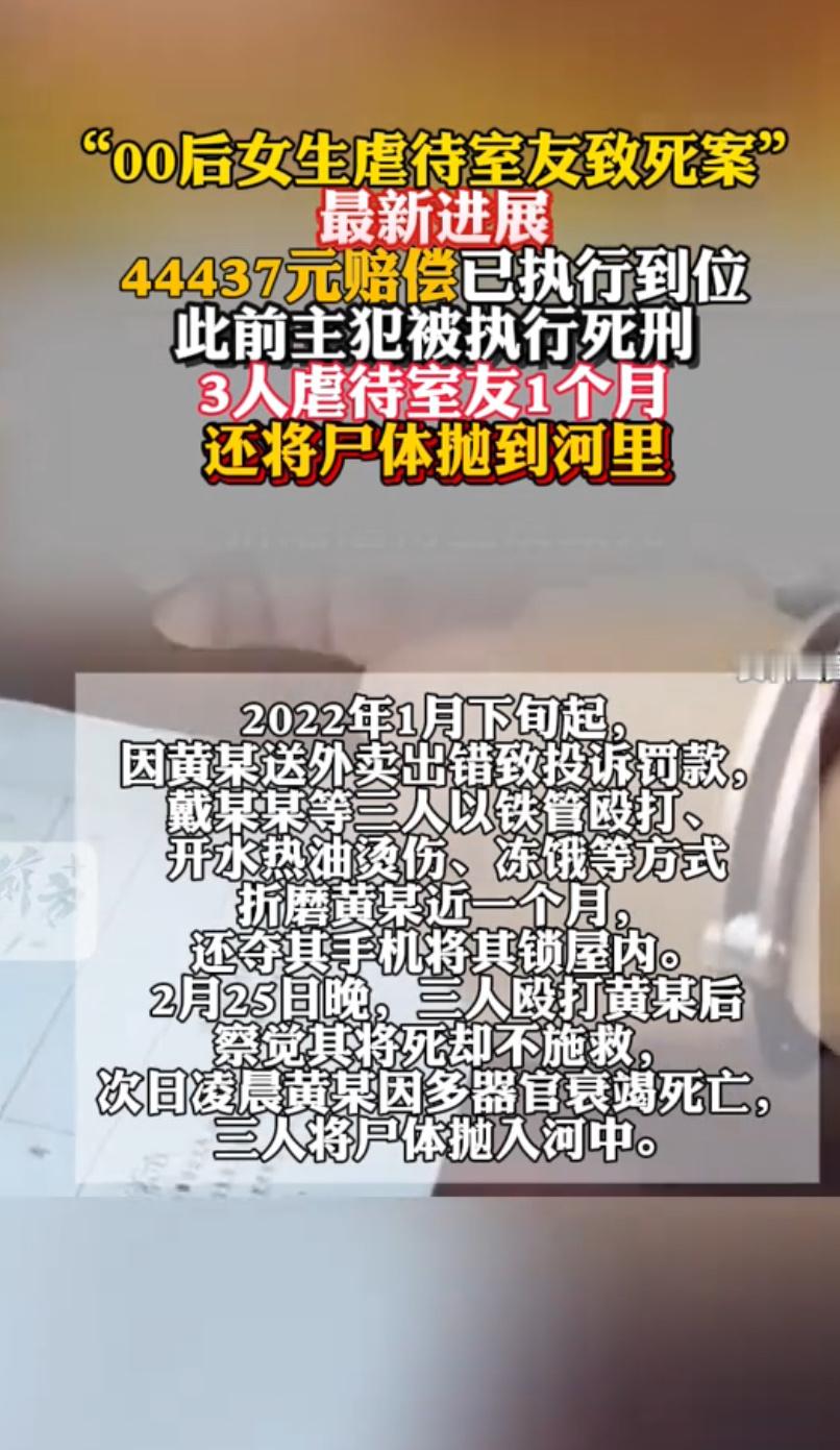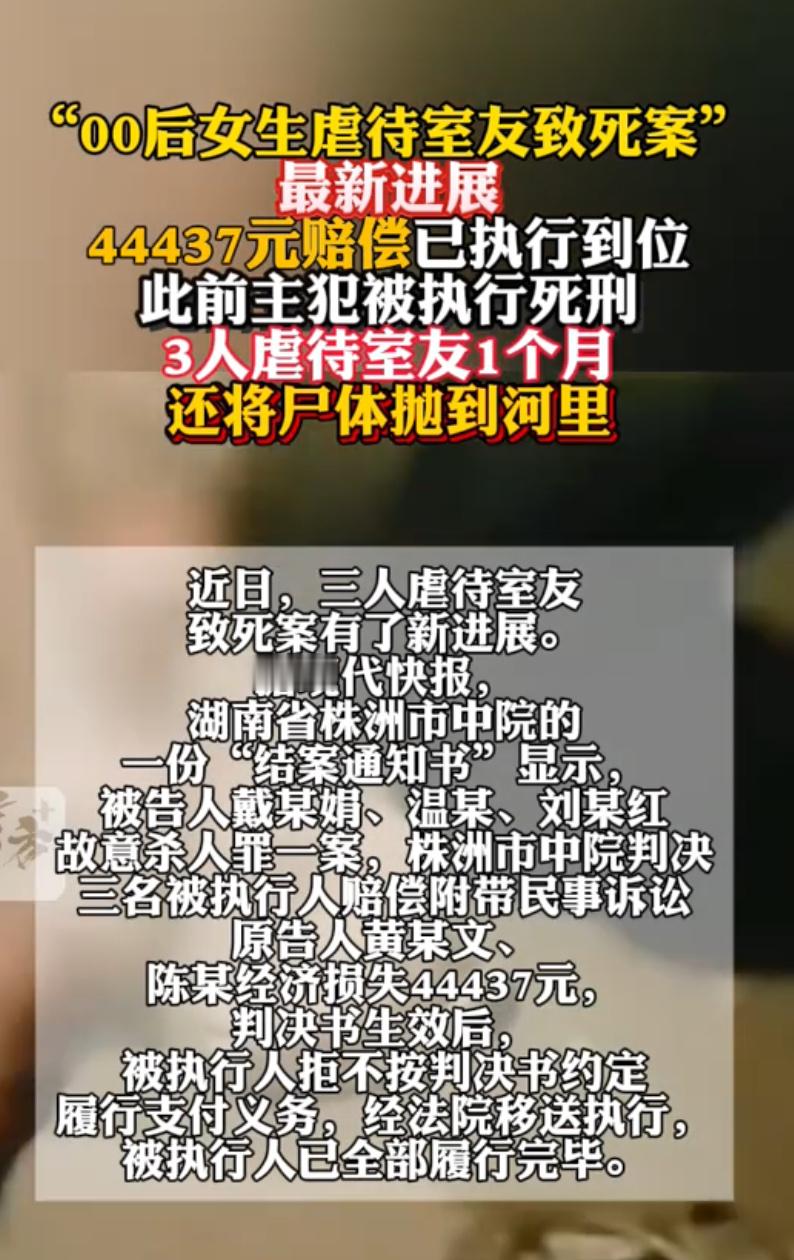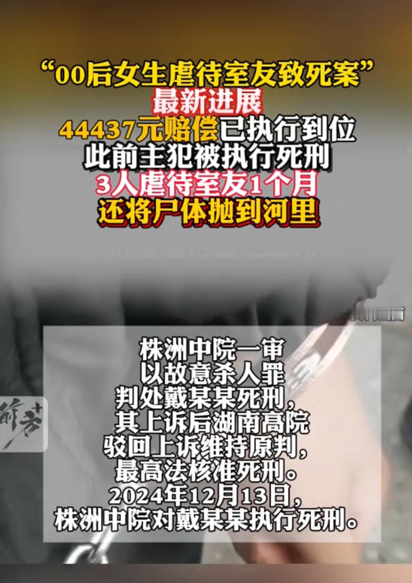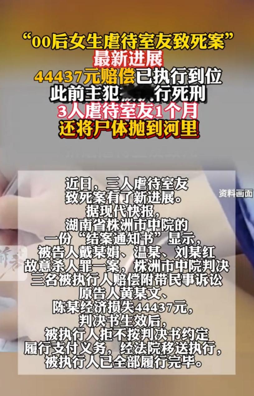 三人虐待室友致死案赔偿已执行2022年,湖南同乡戴小娟等三人在长沙合租期间,因赌债控制+琐事,近一个月内用铁管殴打、开水热油烫伤等方式虐待室友黄某,致其死亡后抛尸湘江。主犯戴小娟2024年被执行死刑,另两人获重刑。
