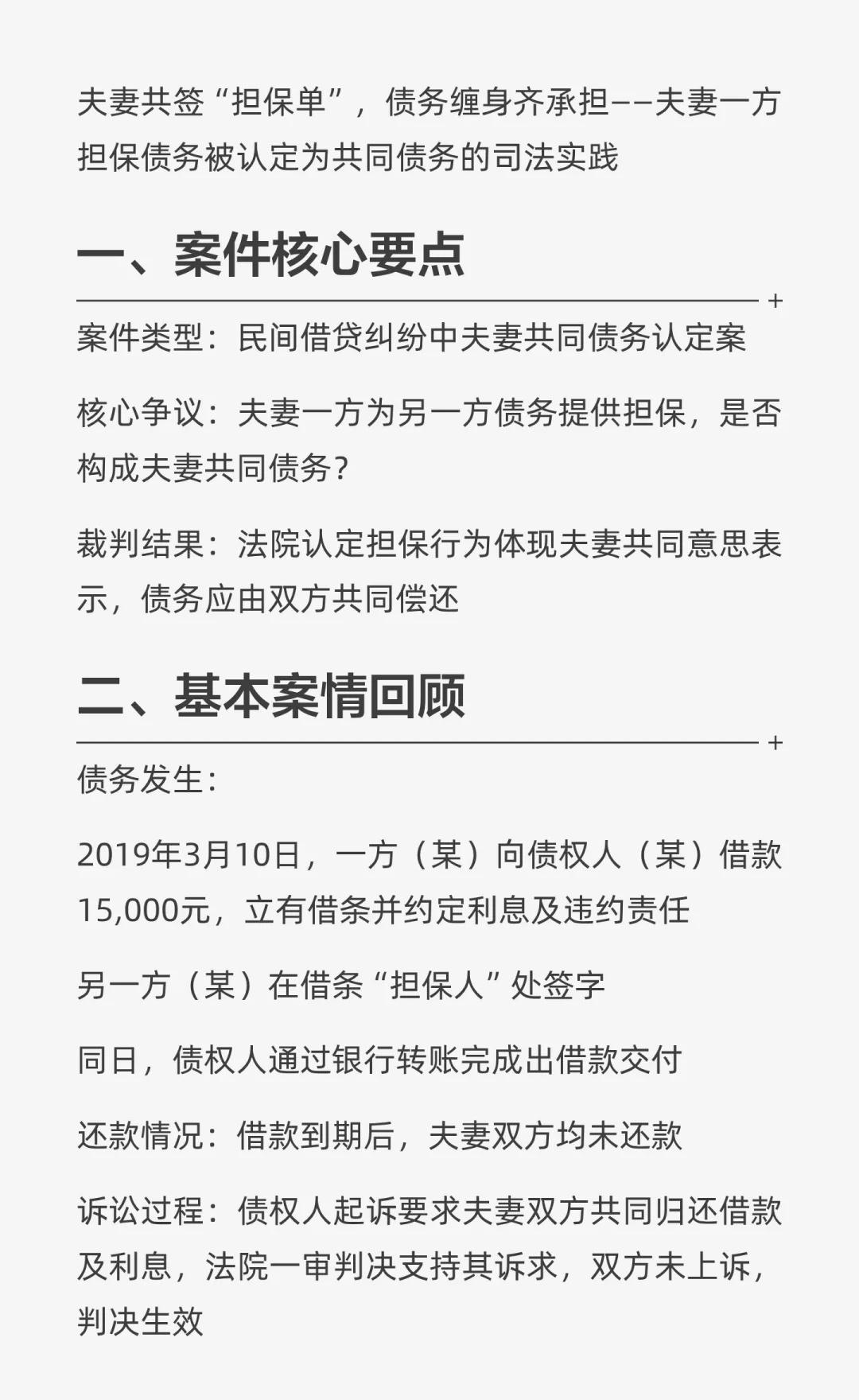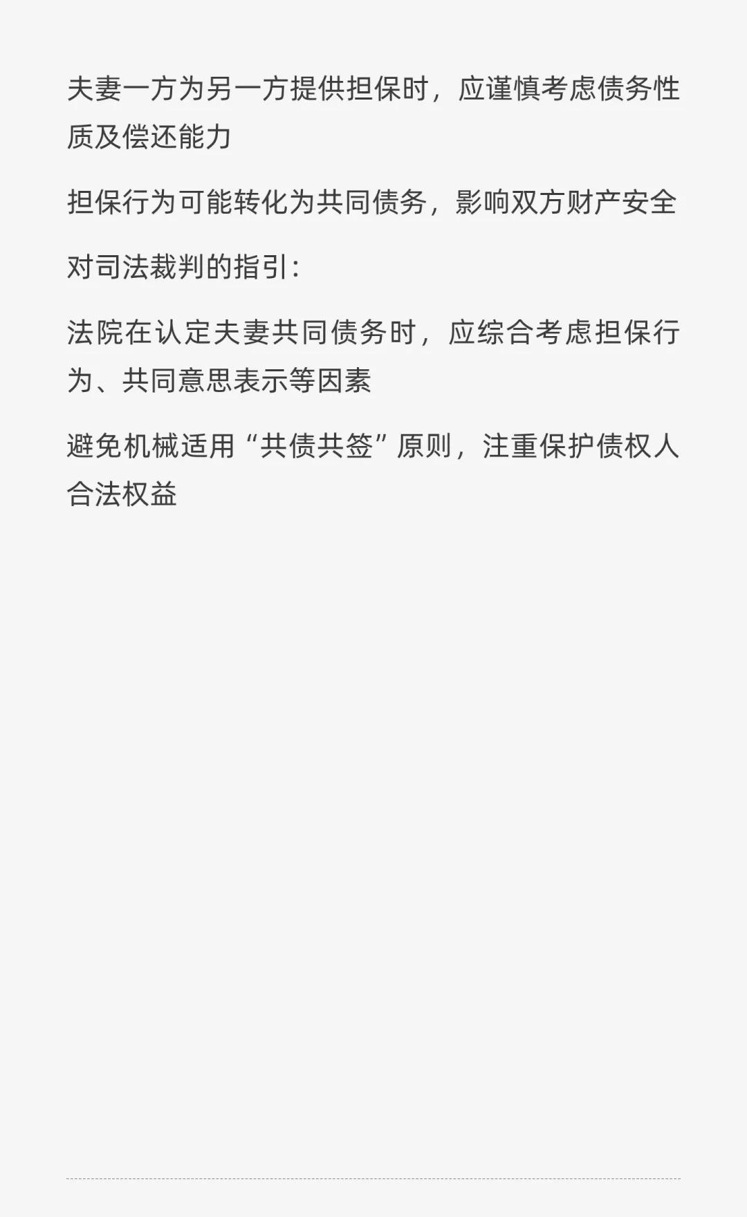 夫妻共签“担保单”,债务缠身齐承担——夫 夫妻一方为另一方债务提供担保,法院认定为共同债务。担保行为体现夫妻共同意思表示,债务应由双方共同偿还。债权人可通过要求夫妻双方签字或非借款方提供担保降低风险。 法律服务 律师咨询 律师 北京律师 法律咨询 夫妻共同债务 夫妻共同财产 夫妻共同债务纠纷 夫妻共同债务认定