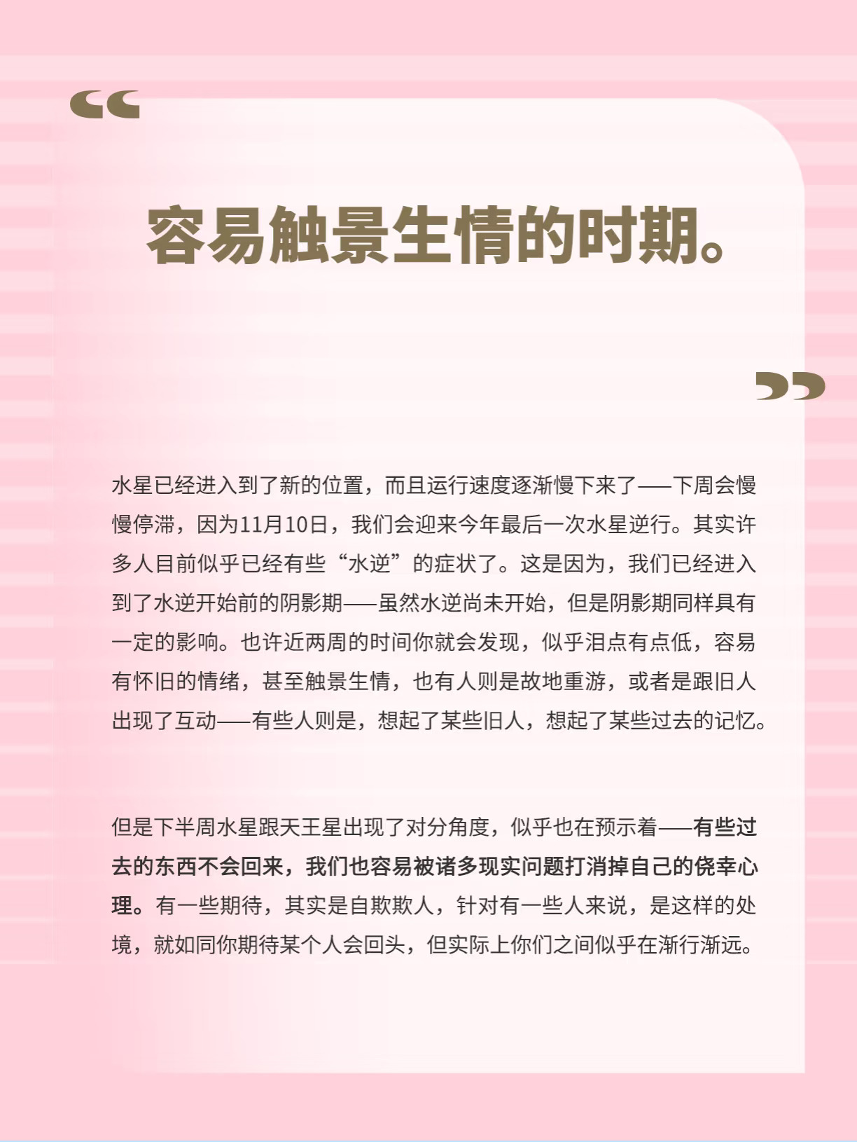 水星已经进入到了新的位置,而且运行速度逐渐慢下来了——下周会慢慢停滞,因为11月10日,我们会迎来今年最后一次水星逆行。其实许多人目前似乎已经有些“水逆”的症状了。这是因为,我们已经进入到了水逆开始前的阴影期——虽然水逆尚未开始,但是阴影期同样具有一定的影响。也许近两周的时间你就会发现,似乎泪点有点低,容易有怀旧的情绪,甚至触景生情,也有人则是故地重游,或者是跟旧人出现了互动——有些人则是,想起了某些旧人,想起了某些过去的记忆。