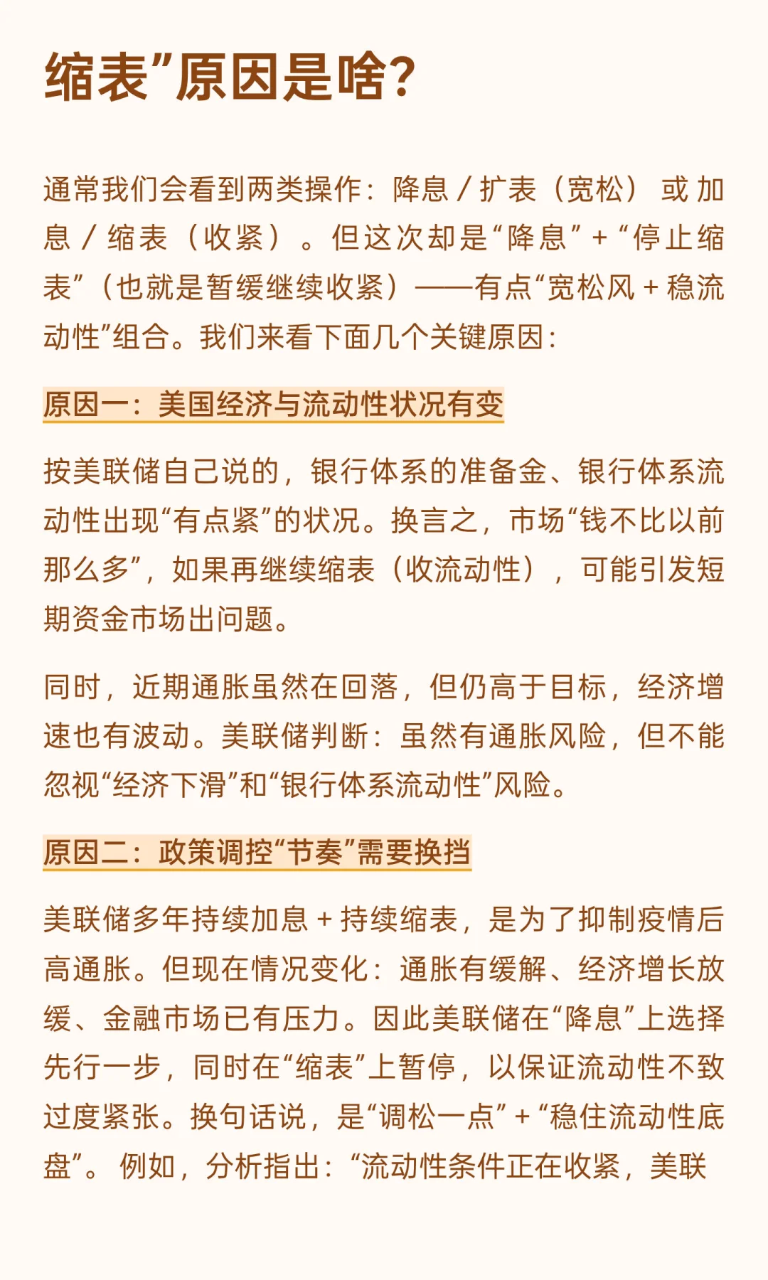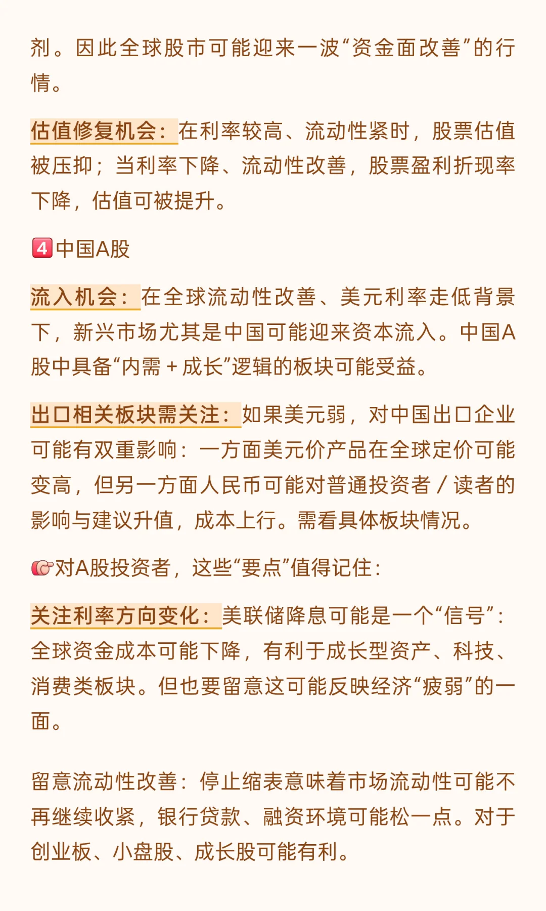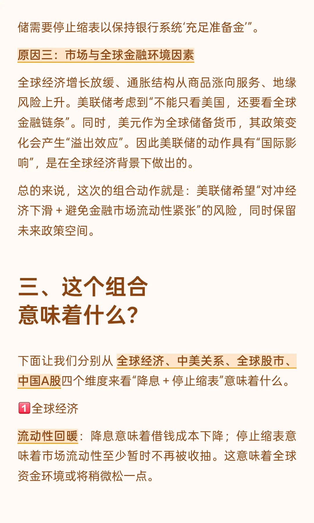 美联储30日凌晨宣布降息,同时停止缩表。简单说,就是又一次“货币政策大动作”来了。 那这是什么意思? 为什么要这么做? 对全球经济、对中美关系、对全球股市、对中国A股有什么影响? 这篇笔记帮大家一起“拆解清楚”~
