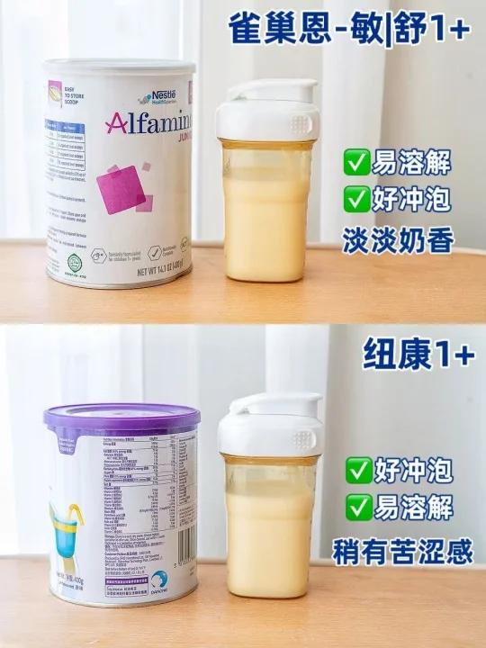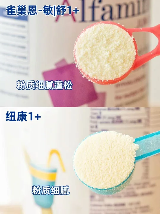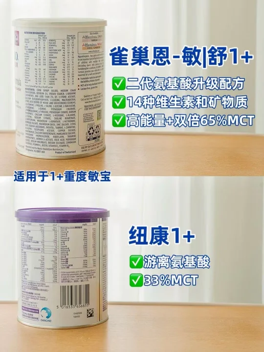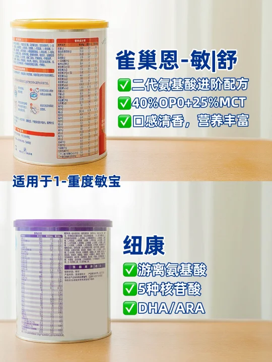 还记得我家宝宝6月龄的时候,脸上、身上突然冒出一片片红点点,一开始以为是干燥,涂了各种霜都不见好[哭惹R]更心疼的是便便也不正常,经常喝完奶就拉肚肚,有时候还会吐奶…每天都这样折腾,宝宝脸蛋都干巴了,身上都没多少肉[失望R] 作为二胎妈妈,我自认为经验丰富但这次真的慌了!闺蜜说是"肠胃不好",我在宝妈群里问了一圈,最后抱去检查发现是重度牛奶蛋白敏敏,也正式开始了氨基酸喂养之路。今天就把我研究过的4款热门氨基酸功课分享出来,希望能帮到大家⬇️ 🔍重度牛奶蛋白敏宝怎么选? 我当时最纠结的就是【恩-敏|舒】和【纽-康特】这两款。 恩-敏|舒是二代氨基酸进阶配方,口感和营养都升级了🆙甄选更贴合亲喂的氨基酸种类,含有8种必需氨基酸和35种营养素,尤其含有40%OPO+25%MCT的黄金脂肪组合,特殊结构的OPO对肠道吸收特别友好👍能促进钙和脂肪吸收,还会让便便松软,更适合肠胃敏感的宝宝。 纽-康特也是老牌子了,一代氨基酸配方,不含OPO有点可惜,更适合本身消化不错的敏宝。 我家当时比较接受🍼恩-敏|舒的口感(剔除苦味氨基酸后确实尝起来不奇怪),第一次喝就轻松空瓶了,转奶也很顺利 🔍1+牛奶蛋白大敏宝怎么选? 做功课时,我也顺便了解了下1+系列的【恩-敏|舒1】+和【纽-康特1+】 恩-敏|舒1+真的让我惊喜!同样是二代氨基酸配方,口感普遍反馈很不错。划重点!足足含有65%双倍MCT,1杯能顶2杯普奶的高能量🔋,给长时间营养吸收不好、缺能量的敏宝喝正合适~而且还含有14种维生素和14类矿物质,蛋白质、钙、铁、维生素D这些都加量强化了🆙,特别适合追赶成长📈的敏宝。 纽康特1+也不错,一代氨基酸配方,营养含量丰富,MCT含量为33%,适合本身发育不错、不需要高能量的敏宝。 我家宝宝小时候喝了6个月恩-敏|舒,第一个月的时候就基本不拉肚肚了,每天都能收获“黄金香蕉便”,脸上白白嫩嫩肉乎乎的每天元气满满[赞R] 作为过来人我想说宝宝健康问题不能马虎!要及时就诊,再根据具体情况和年龄选择合适的奶粉,记得一定要足量喂养超过6个月,才能避免敏敏反复。