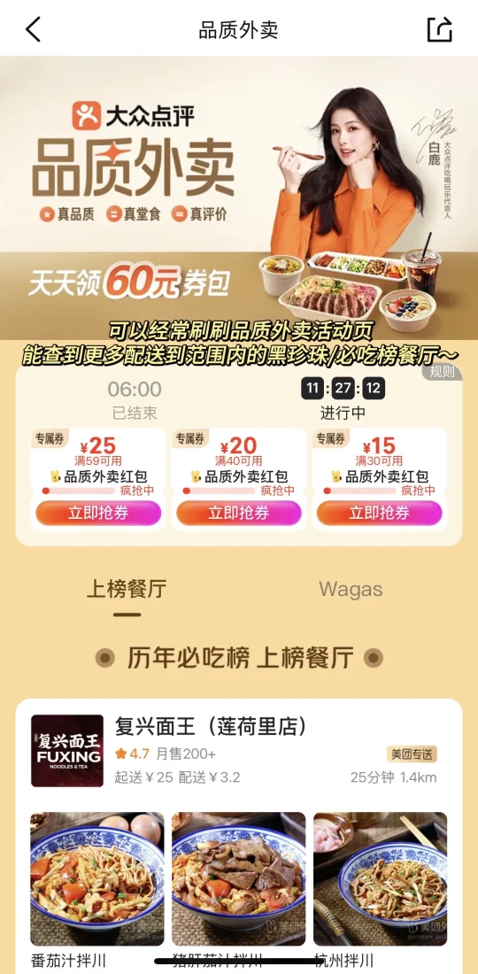 hello 大家好🙋 我是莹莹 一个喜欢研究外食不长胖的女孩!👧 像我们经常外食的姐妹是不是点外卖最担心的就是卫生问题!今天来测评的杭帮菜,都是通过点评的品质外卖来点的!有真实的线下堂食门店!外食的姐妹也不止不用担心点到脏摊,甚至还有点评必吃榜和黑珍珠的外食哦~ 【常见热门菜品热量】 1️⃣蛋黄鸡翅130大卡/个 2️⃣杭椒炒牛肉30大卡/口 3️⃣酸菜鱼27大卡/口 4️⃣石锅牛蛙8大卡/颗 5️⃣竹园鸡25大卡/块 6️⃣老底子杭三鲜20大卡/勺 ✅像比较适合我们管理期吃的有葱油鲈鱼、竹园鸡、酸菜鱼、石锅牛蛙、葱油花蛤、沼虾这些高蛋白的都挺适合我们管理期的姐妹吃,像辣椒小炒肉、卤鸡爪、松板肉、猪蹄这些油脂和脂肪含量会高很多,要吃的姐妹一定要控制好整天的热量哦~ ⭕️像我们经常工作因为没什么时间而需要点外卖的打工人,真的需要重视一下食品的卫生,每天上班就很辛苦了,要是点到了重生之卖炒饭的商家,一天的心情也都会变得很糟糕。所以建议很多管理期的姐妹,点外卖一定要看仔细,尽量选择线下吃过的店铺,或者知道他们后厨长什么样子的,即使价格会贵一些,但是食品的品质上来了,卫生对我们来说才是主要的!【饮食健康一定需要关注起来】 不知道怎么选的姐妹,可以直接去点评👉品质外卖而且如果有评分的加持在口味的方面就更不用担心啦!还有点评必吃榜可以参考!重点评价都是真实的用户写出来的,再也不用担心踩雷了~ 好了,本期的分享就到这里啦 我们下期再见👋