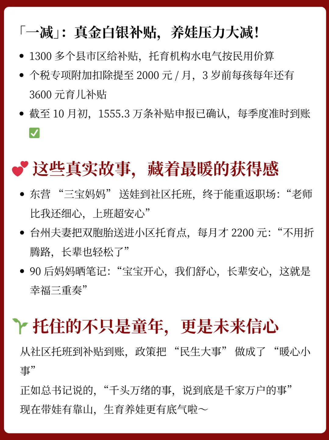 育儿有自己的节奏,信息爆炸的时代,克制,坚持,辨别比什么都做更重要。 🔥「一增」:托位家门口随便用,2024年全国托位数超573wan,今年还要新增66wan!上海“宝宝屋”、济南家庭托育点,也太香了~ 🔥「一减」:养娃补贴真金白银!1300多个县市区发补贴,个税扣除提至2000💰/月,3岁前还有育儿补贴,申报超1500wan条,到账很准时~ 💖真实故事太暖心!东营三宝妈重返职场、台州双胞胎家庭轻松带娃,90后妈妈直言幸福三重奏~