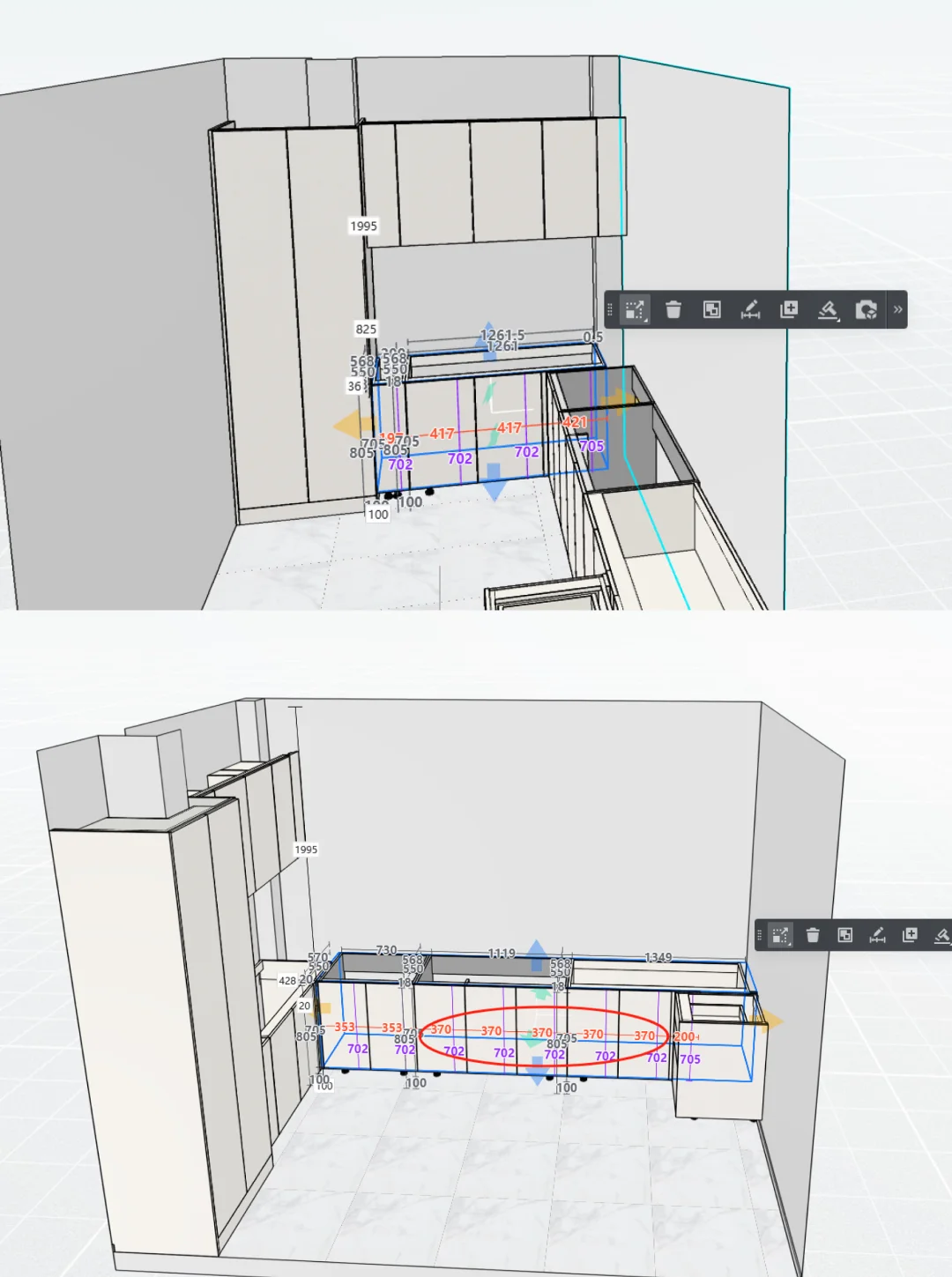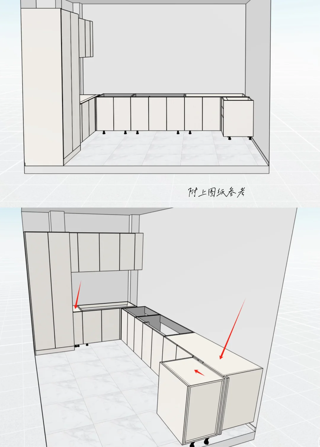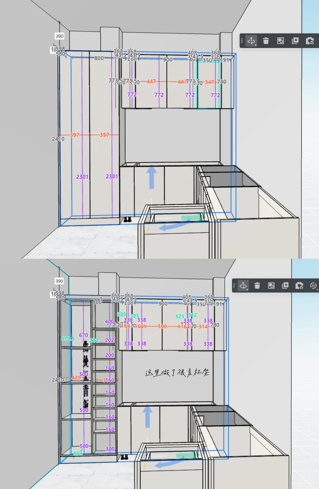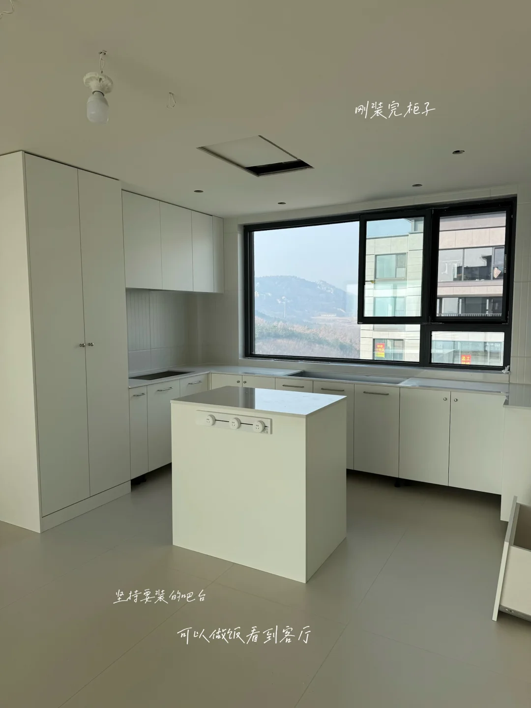 因为厨房空间长3.8米,左右做完橱柜各0.7米,只剩2.4米宽了,而我想拥有一个大岛台,和一个长餐桌,宽度有些受限。