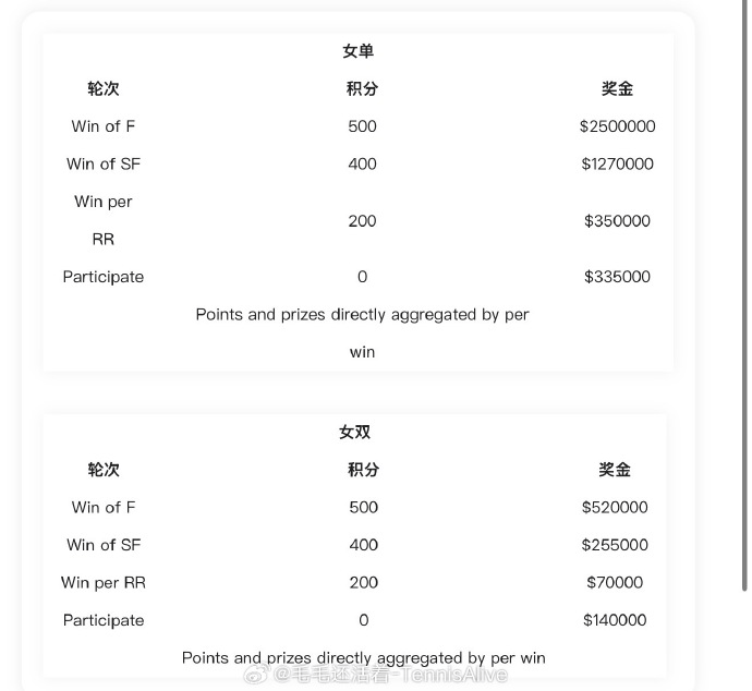 单打:出场费33.5w美金,小组赛赢一场可另外得35w美金