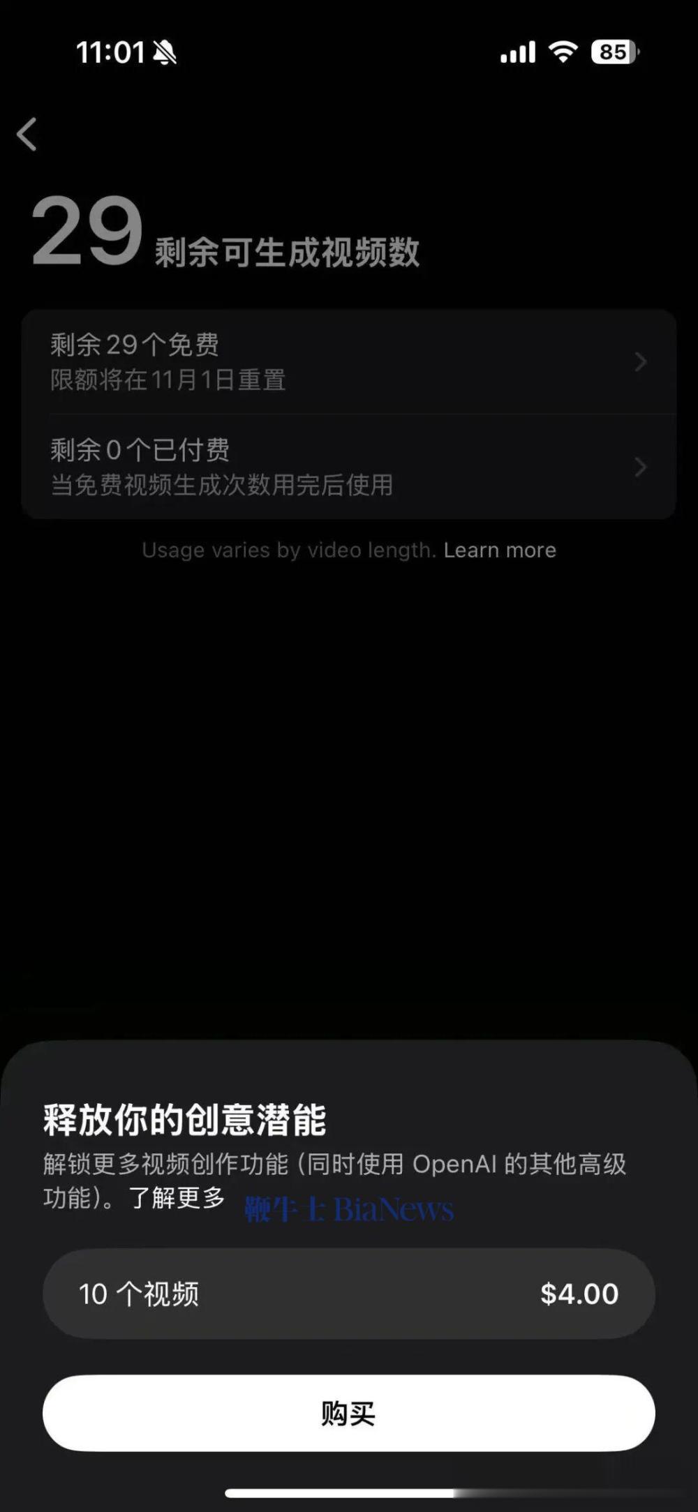 付费购买生成次数显示Sora正在压低“免费”门槛,以控制资源消耗;