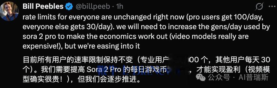 Peebles在X上的发言指出:“我们推出额外生成购买功能,主要是因为我们的“重度使用者”需求非常大,而在当前经济模型下,这样的高频使用是不可持续的。我们以为30次/天会足够……显然我们错了。”