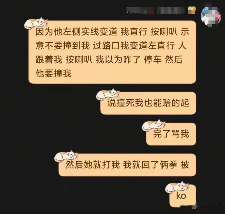 近日机车眼红被打后续来了, 白衣大姐手打骨折了, 机车网红黑丝姐头盔被干碎了, 原来当时黑丝姐骑车正常直行, 白色练车大姐突然压实线变道, 吓了她一跳,于是她就按了喇叭, 之后她就在前面等红灯, 结果白色轿车女司机就追上她, 骂她,疑似被刚才她按喇叭激怒了, 两人随后开始了互骂, 白色轿车女司机下车后就与她打成一片,趁黑丝姐一个不注意标准过肩摔, 随后压制黑丝姐开始了单方面虐杀, 黑丝姐只能用脚蹬白衣大姐, 幸亏黑丝姐带了头盔, 所以伤的不重, 旁边的男司机用手机记录下了两人的战斗,要不是有人要他挪车, 他估计要吃个完整的瓜, 事后网友私信黑丝姐, 问她是不是白挨, 黑丝姐表示对方打她的手骨折了! 看来白衣大姐挥舞拳头是真的狠, 大家对于黑丝姐和轿车女司机因为路怒互殴怎么看? 女司机 机车女孩 被打了还手是互殴还是正当防卫? 网红女骑手事故 豪车女打人 女司机逆行打人