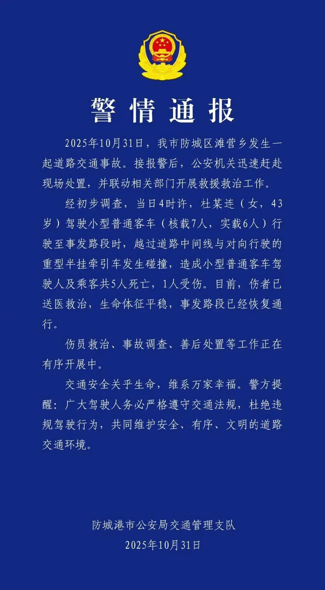 凌晨四点的国道上,一声巨响撕碎了广西防城港的宁静。43岁的杜某连驾驶着白色小客车,突然越过道路中间线,一头撞向对向驶来的重型半挂牵引车。 这场发生在防城区滩营乡的惨烈车祸,让5条鲜活的生命永远定格在了这个秋夜——包括司机本人在内,车上6人中5人死亡,仅1名乘客侥幸生还。 根据警方通报,事发时杜某连的小客车核载7人实载6人,本是一趟普通的亲友出行。可当车辆驶入弯道时,监控画面显示白色小客车突然像脱缰野马般冲向对向车道。 重型半挂牵引车司机在最后时刻猛打方向避让,但两车还是以近乎垂直的角度狠狠相撞。半挂车的钢铁车头直接撕裂了小客车的驾驶室,金属扭曲的刺耳声响里,夹杂着乘客的惊呼与刹车声。 “那声音像放炮一样,我鞋都没穿就往外跑。”附近村民回忆,赶到现场时,小客车已经严重变形,消防员用液压钳剪了20多分钟才救出被卡在副驾驶的伤者。 而驾驶座上的杜某连早已没了生命体征。这场事故的惨烈程度,让连夜赶来的家属在警戒线外瘫倒在地——5名死者中,有刚结束夜班准备回家的工人,有带着孩子探亲的母亲,他们的背包还散落在路边,里面装着没吃完的早餐和给家人的礼物。 “我姐开车10年了,平时连剐蹭都没有!”杜某连的弟弟在殡仪馆外反复念叨。据亲友透露,杜某连是当地小有名气的“女司机”,早年靠跑运输养家,后来开了家小超市。 可这次事故中,她驾驶的车辆却像完全失控:既没有刹车痕迹,也没有任何避让动作。有交通专家分析,从车辆轨迹看,极可能是司机分神或操作失误导致越线,而凌晨四点正是人体最疲劳的时段。 这起事故与10月4日湖北利川那场5死8伤的车祸形成残酷对照。当时54岁的熊某琴穿着高跟鞋开车,把油门当刹车冲向人行道,车身上还贴着“实习”标志。 两起事故间隔不到一个月,却都指向同一个问题:开车不是“会踩油门”就行,而是要对生命有敬畏心。 唯一生还的乘客是后排的陈女士。她躺在病床上回忆:“我刚说完‘前面弯道要小心’,就感觉天旋地转。”她的右腿骨折,但更痛的是心理创伤——坐在她前排的丈夫和7岁女儿,都没能活下来。 医生透露,陈女士入院后一直拒绝进食,反复问:“为什么是我?”而她的丈夫,本是家里的顶梁柱,女儿才上小学二年级。 这样的悲剧并非个例。数据显示,我国每年因越线行驶引发的交通事故超万起,其中凌晨时段的事故率是白天的3倍。交警部门提醒:“夜间开车一定要降低车速,尤其是弯道和视线受阻路段,宁可慢三分钟,不抢一秒钟。” 当我们在键盘前讨论“女司机技术差”时,是否想过:每个司机都可能是“潜在的危险源”?杜某连的亲友说她“开车稳”,可稳不代表安全;熊某琴的女儿刚给她买新车,却没想到成了“催命符”。这两起事故暴露的,是部分司机对交通规则的漠视,对驾驶风险的低估。 “我考了驾照就敢上路,但真的准备好对生命负责了吗?”网友“小满”的评论引发万人点赞。确实,开车不是游戏,没有“重启键”。每一次变道、每一次超车、每一次踩油门,都可能决定几个家庭的命运。 此刻,如果你正准备开车出门,请先问自己: 1. 我昨晚睡了多久?(疲劳驾驶是头号杀手) 2. 我系安全带了吗?(后排乘客死亡案例中,70%未系安全带) 3. 我分得清油门和刹车吗?(新手误踩概率是老司机的5倍) 5条生命的消逝,不该只是新闻里的数字。它们是5个家庭的顶梁柱、是5双孩子的眼睛、是5对父母的牵挂。愿我们记住这个血色的秋夜,记住方向盘上握着的,不仅是自己的命,更是别人的幸福。 你身边有过“差点出事”的驾驶经历吗?或者你有什么行车安全小贴士想分享?评论区聊聊吧,你的每句话,都可能救下一条命!警方通报女子驾车撞上半挂致5死