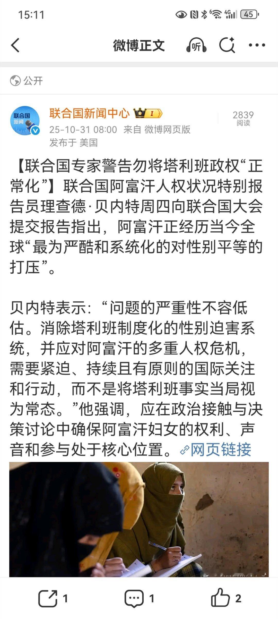 塔利班政权是人类的耻辱【联合国专家警告勿将塔利班政权“正常化”】联合国阿富汗人权状况特别报告员贝内特向联合国大会提交报告,指出塔利班正实施全球最严酷的性别压迫制度,警告国际社会勿将其政权"正常化"。报告强调必须将阿富汗妇女权益作为国际接触的核心议题。