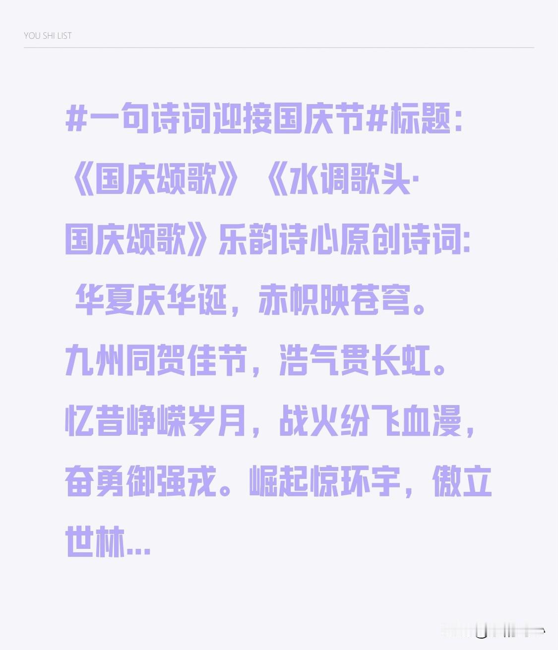 《水调歌头·国庆颂歌》乐韵诗心原创诗词: 华夏庆华诞,赤帜映苍穹。九州同贺佳节,浩气贯长虹。忆昔峥嵘岁月,战火纷飞血漫,奋勇御强戎。崛起惊环宇,傲立世林雄。 看今朝,科技盛,业昌隆。高楼林立,车水马龙乐声融。航母巡洋威壮,高铁飞驰风掣,盛景闪耀世界的美好愿景。