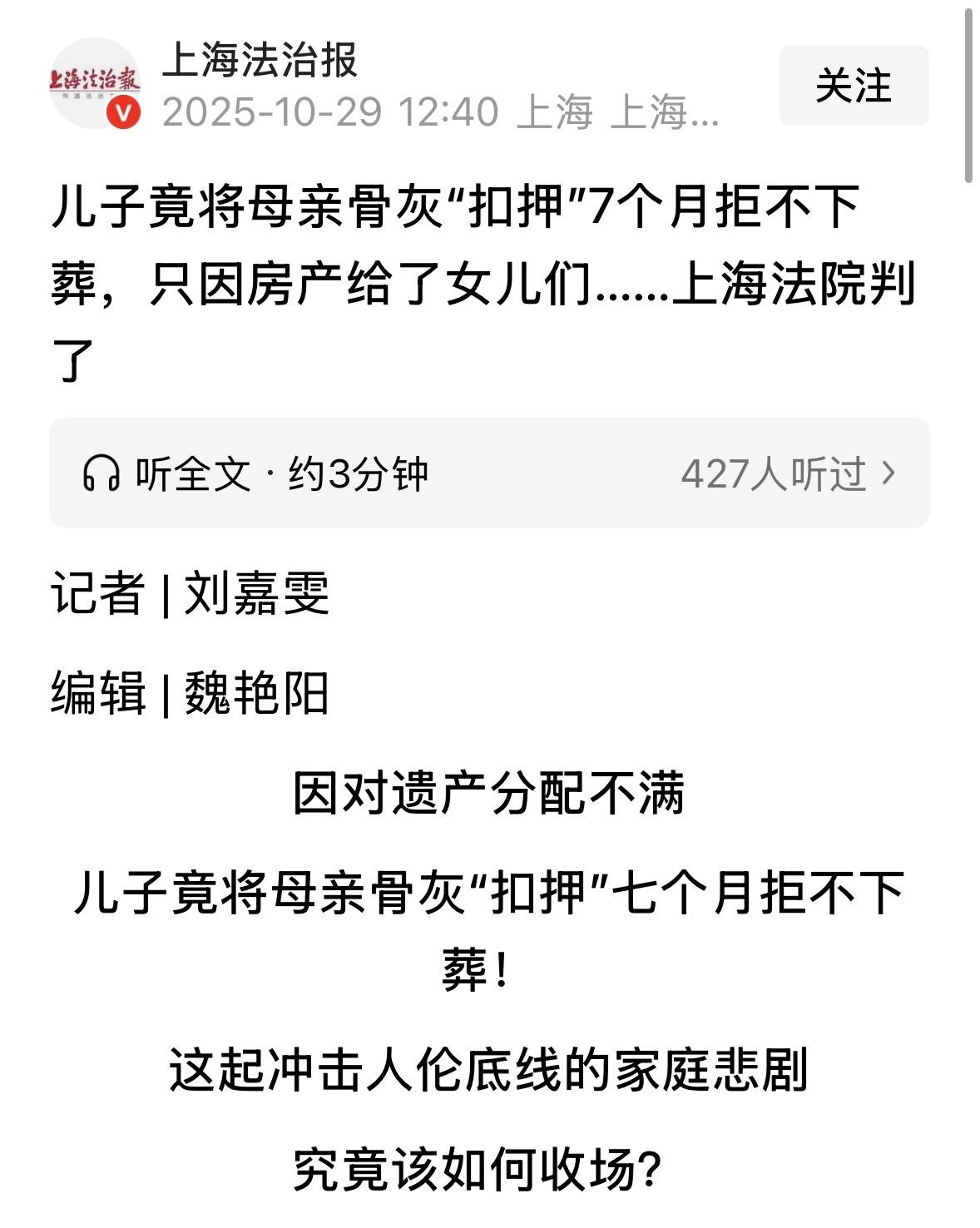 上海,老人生前和老伴一起买了一处合葬墓穴,老伴走后落葬没几年,老人也去世了,没想到,儿子因老人把遗产全部留给了女儿们而心生不满,他要求三姐妹书面承诺放弃遗产,遭到拒绝后,男子心态崩了,他给墓园放狠话,不准任何人给母亲安排落葬,导致老人的骨灰一放就是7个月,看着母亲迟迟无法入土为安,三姐妹没辙了,只好不顾亲情将男子和墓园方一起告上法庭,法院判了! 河南陈家的葬礼刚结束,三个女儿就哭着发现:母亲的骨灰取不出来了! 不是墓园不给,而是亲弟弟王某(化名)攥着墓穴证件,撂下狠话:“你们不写放弃遗产的承诺,我就不到场,谁也别想让妈下葬!” 这一耗,就是 7 个月。 母亲的骨灰在墓园寄存着,而姐弟四人的矛盾,早从陈阿姨(化名)留下遗嘱那天就埋下了伏笔。 老两口生前早有打算,在墓园买好了合葬墓穴,证件上明明白白写着夫妇俩的名字。 父亲走得早,证件就交给儿子王某保管,2022 年陈阿姨因病去世前,特意做了公证遗嘱,把名下房产留给三个女儿,陈阿姨大概想都没想到,自己走后,连 “入土为安” 都成了难题。 陈阿姨火化后,女儿们去办落葬手续,才知道弟弟卡着证件不撒手,王某觉得,房产都给了姐姐们,自己没得到好处,心里不服气,非要姐姐们签 “放弃继承” 的书面承诺才肯配合。 可遗嘱是母亲公证过的,姐姐们不愿妥协,王某就来硬的,用骨灰当筹码,说 “我不到场谁也别动”。 多次沟通无果,三个女儿只能把王某和墓园一起告上法院。 这事情在网上传开后,有个网友说自己的母亲近 90 岁,他主动接回家照料。 虽有两个哥哥,且哥哥们也尽孝,但他家条件更优,日常喂饭、陪诊更方便。 他认为照顾母亲是天经地义,从不会因其他兄弟姐妹的态度计较得失,直言拿照顾父母算得失太不应该。 庭审时,法官的话一针见血:“墓穴是给老两口买的,使用权本来就是逝者的,子女只是帮忙办事,没资格拿这个要挟人。 入土为安是老祖宗传下来的规矩,也是法律保护的公序良俗,拿这个争财产,既违法又违心!” 最终法院判了,王某必须配合墓园办落葬,他想凭证件单方面说了算的主张,直接被驳回。 这事看着是姐弟争财产,实则藏着两个关键问题。 一是老两口虽有遗嘱,却没把 “后事安排” 说透 ,比如墓穴证件该怎么用、落葬要走哪些流程,没提前跟子女约定好,才给了王某钻空子的机会。 二是家庭沟通早断了线,弟弟觉得财产分配不公,不找姐姐们好好谈,反而用伤害逝者尊严的方式逼对方让步,亲情早被钱磨没了。 其实法院的判决不只是给陈家一个结果,更是给所有人提了个醒,处理遗产别只盯着房子、钱,后事安排同样要早做打算。 比如公证遗嘱时,顺便把墓穴使用、落葬流程写清楚,找个第三方见证,子女之间有分歧,先找调解,别拿逝者当筹码。 法官在判决中明确强调,子女安葬父母骨灰,是民间习俗、传统伦理,更是社会主义道德要求。遗产有争议应走法律途径,绝不能拿老人身后事撒气。 王某即便对分产有疙瘩,也不该将怨气撒在母亲骨灰上,违背 “入土为安” 的愿望,如今陈阿姨落葬。 可陈家姐弟的关系,恐怕再也回不到从前,说到底,钱没了能再挣,亲情裂了难修补,而让逝者安心入土,才是做子女最基本的本分,这点,比什么都重要。 对此,你有什么看法呢? 信息来源:上海法治报