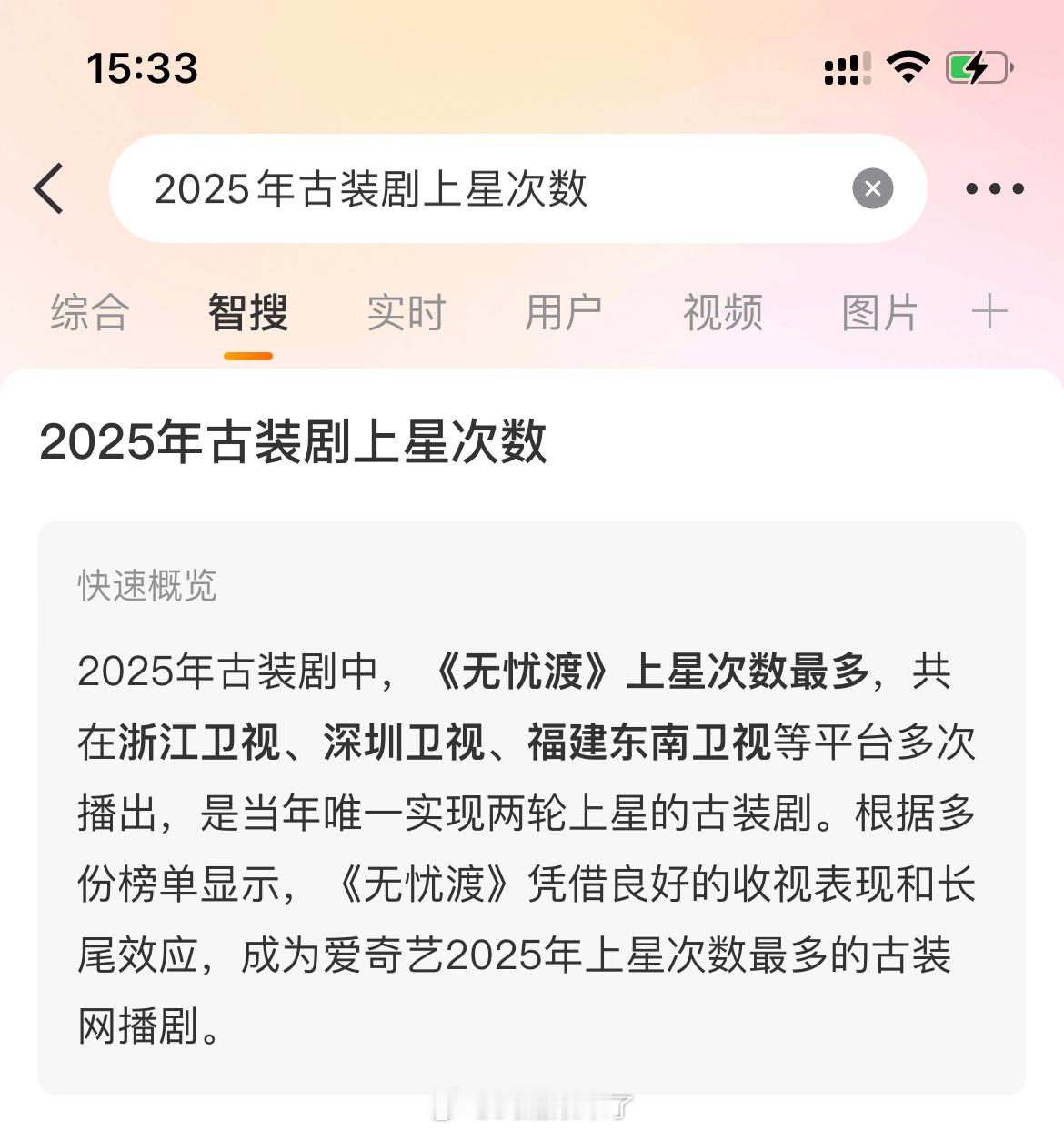 2025年播出的古装剧,《无忧渡》成为上星次数最多的古装剧,在浙江、深圳、福建东南等卫视多次播出👍