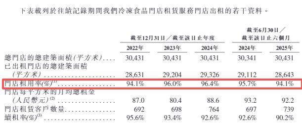 招股书显示,2022年、2023年、2024年和2025年上半年(下称“报告期内”),尽管红星冷链门店租用率保持稳定,且门店每平方米的月均总租金和门店租赁客户数量均呈增长趋势,但其续租率已经从2022年的95.6%降至今年上半年的90.2%,累计降幅5.4个百分点。