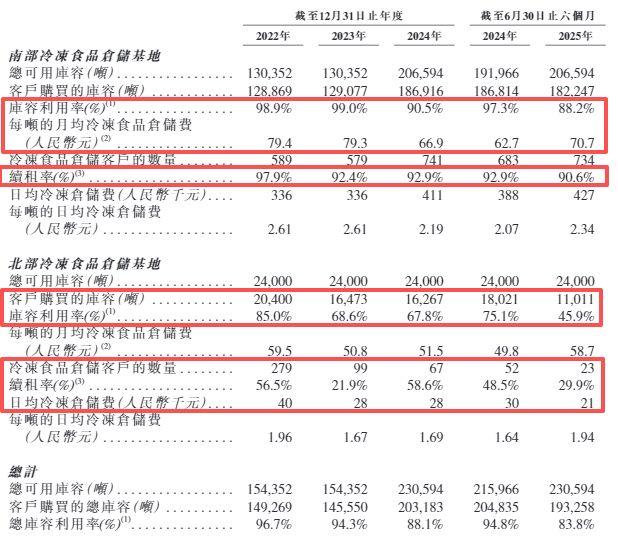 而北部基地的数据下滑则更为严重:该基地报告期内客户购买的库容从2.04万吨降至约1.1万吨,累计降幅46%,这导致公司库容利用率从85%大幅降至45.9%。此外,虽然每吨的月均冷冻食品仓储费保持相对稳定,但该基地的客户数量从279家降至了23家,累计降幅达91.76%。日均冷冻仓储费更是几乎“腰斩”。