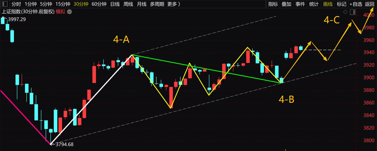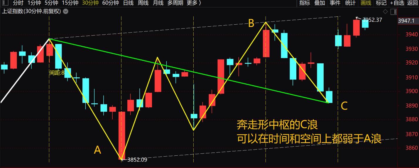 昨天大盘打穿3895点之后,其实这波C浪的下跌,就已经满足了最小跌幅的要求,说白了,该跌的空间已经跌到位了。之前就跟大家说过,这波奔走形中枢的C浪,本身就弱于A浪,所以它根本不会去碰下跌下轨。这种弱势,既可以是空间上跌得少,也可以是时间上跌得短,甚至两者都占。昨天打穿3895点,就已经把下跌的必要条件完成了,这波调整,最晚今天早盘稍微下探一下,就彻底宣告结束了。