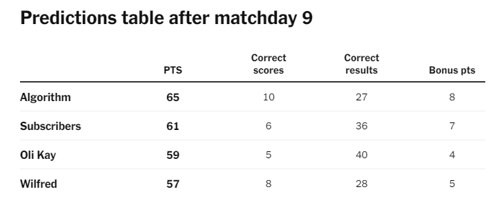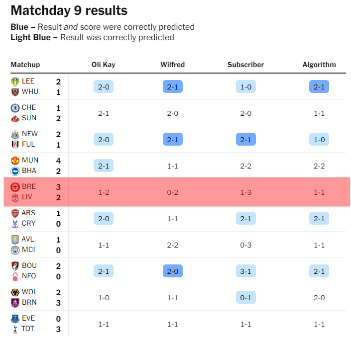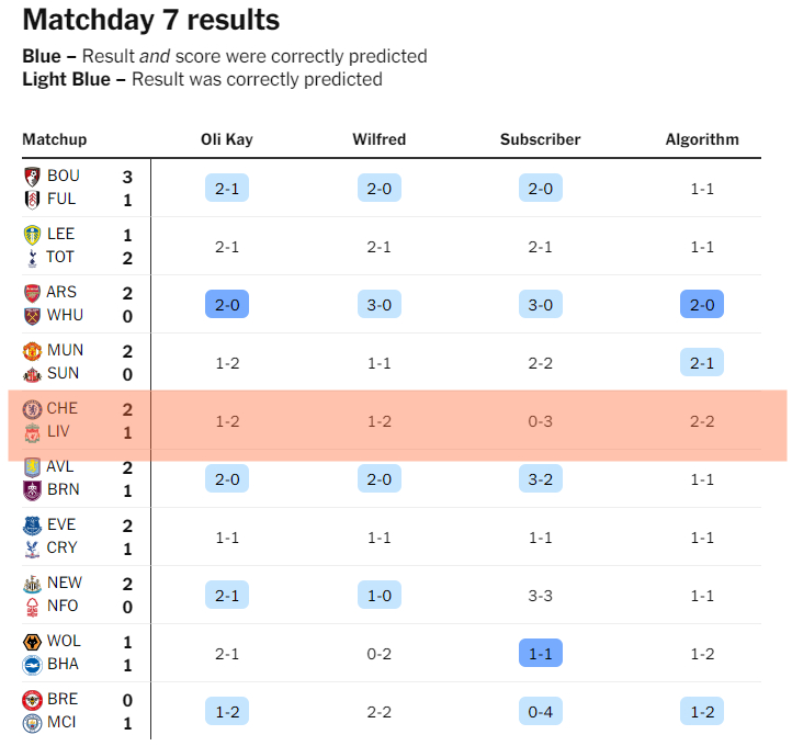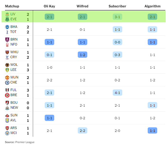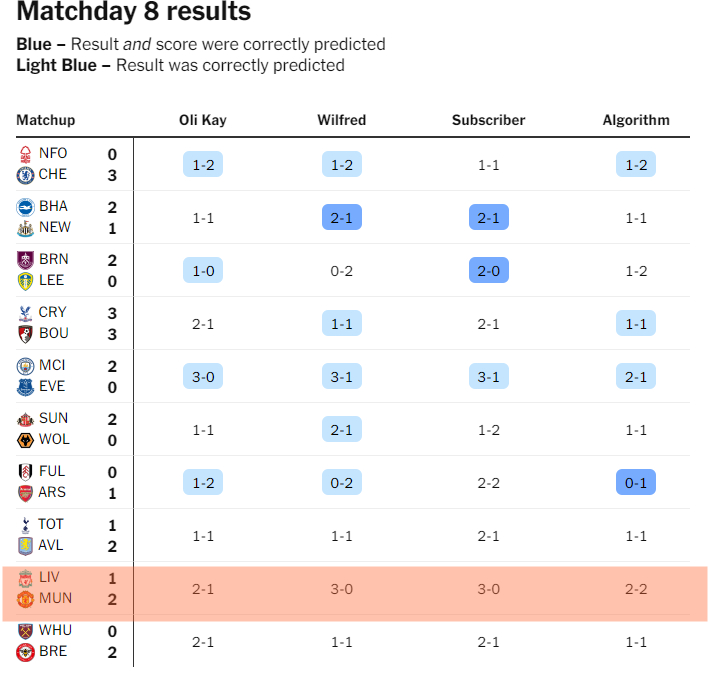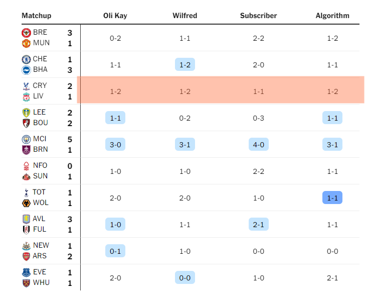 TA本赛季每轮都会安排四人参与英超赛果预测 —— 包括一位特邀订阅用户、6 岁的威尔弗雷德、AI预测算法,以及名记奥利弗凯 (作者),上轮被小蜜蜂蜇得全军覆没,本轮继续“掐指一算”连比分都是统一的2-1[二哈]