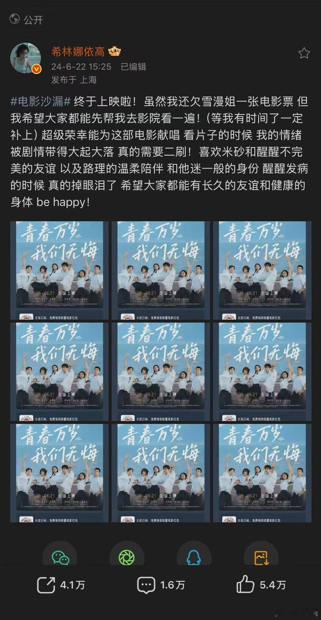 希林娜依高电影ost唱嗨了真包场希林娜依高即兴包场 也太宠作品了吧!刚为《即兴谋杀》唱完《即兴演出》片尾曲,转头就包场让大家感受影院版歌声,之前《沙漏》《热辣滚烫》也这样,行动力绝了~