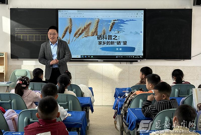 当课件展示“世界硒都——恩施”的介绍时,贺健满怀自豪地分享:“我们的家乡恩施是‘世界硒都’,这里拥有全球唯一的独立硒矿床,也是世界上硒资源最富集的地区。我们脚下的这片土地,还能种出富含营养的‘富硒植物’,它们就像是家乡的‘魔法宝贝’!”屏幕上,神秘的硒矿床洞穴、生机盎然的富硒植物画面一一呈现,引得孩子们发出阵阵惊叹:“原来我们的家乡这么了不起!”
