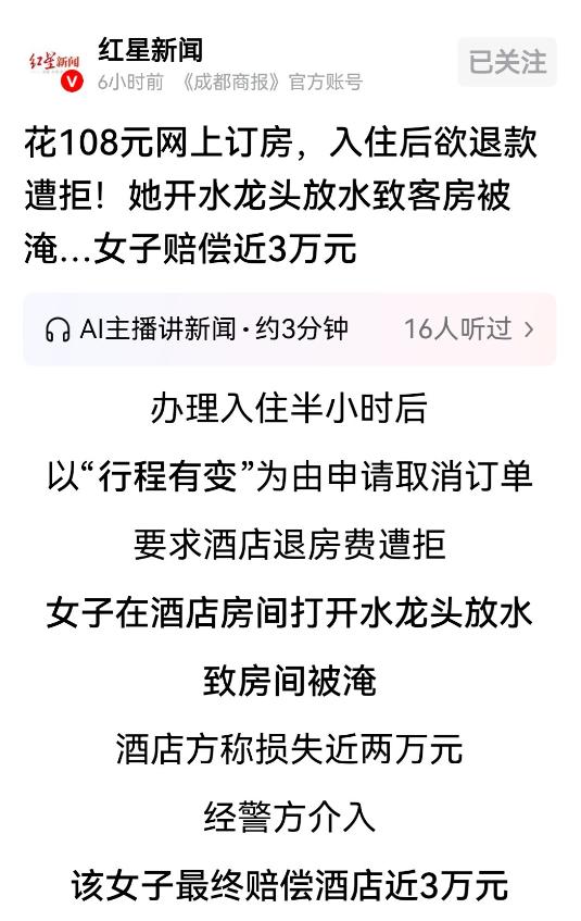 太恶劣!海南三亚,女子花108元在网上订了一间酒店客房,入住半小时后,女子要求取消订单。酒店根据平台规定,已实际入住的房间,无法退款,但提出,可以给她免费升级换房间。可怎么解释女子都不听,非退房退款不可。酒店拒绝后,女子先投诉,后报警,然后打开水龙头,把房间内的被褥、枕头、床单,都扔进卫生间,把洗漱用品倒在被褥上打开花洒。导致直接损失2万多元,酒店报警,处理结果,令人们意想不到。 三亚某酒店保洁阿姨傍晚推开 203 客房门时,当场愣住:淋浴区堆着湿漉漉的被褥、枕头,花洒开至最大档淌水,地板积水漫到脚踝,洗浴用品全被倒空,墙上壁纸泡得卷边,楼下客房天花板还在滴水,客人正拍桌投诉。 谁能想到,这一地狼藉是住了仅半小时的女客人所为,10月28日,该女子网购 108 元订下这间房,入住半小时后突然找前台,以 “行程变更” 要求全额退款。 酒店按平台规则解释:“您已入住使用,布草、水电产生成本,无法全额退,我们可免费升级带阳台的大床房,您看行吗?” 这一折中方案却被女子一口拒绝,她当场情绪爆发,先打政务平台投诉,再报警求助。 民警协调半天无果,女子竟转头冲进房间实施 “破坏性报复”。 监控清晰记录:她将床上用品全扔淋浴区,拧开花洒不管,倒空洗发水、沐浴露,随后摔门而去。 酒店连夜核算,直接损失超 2 万元 ,是 108 元房费的近 200 倍,涵盖泡坏地板重铺、壁纸更换、楼下天花板维修、客人赔偿及损毁布草、洗浴用品的费用。 此事核心有二: 一是规则层面,“已使用不退全款” 是酒店、机票行业惯例,入住半小时产生清洁、房源空置等成本,酒店升级房间已属让步。 二是法律层面,民警表示,故意毁坏公私财物超 5000 元可立案,超 2 万元达 “情节严重” 标准,若酒店坚持追究,女子不仅要全额赔偿,还可能面临刑事处罚。 网友热议:“维权是权利,不是撒野理由”“108 元房毁出 2 万祸,太不值”“订房时该选‘免费取消’,自己没看规则怎能怪酒店”。 此事也给双方提了醒:消费者订房、订票前,花 10 秒看清退改规则,遇纠纷可找平台仲裁、消协帮忙,切勿以 “毁东西” 泄愤,否则后果自负。 酒店需在预订页显眼标注退改规则,遇情绪激动客人多耐心沟通,及时保留证据,避免 “小纠纷” 变 “大损失”。 目前酒店已报案,损失仍在进一步核算。 想必女子此刻追悔莫及,早知如此,当初接受升级房间或接受部分退款,也比赔 2 万、可能留案底强。 说到底,维权需讲方法,情绪不能越界 , 一时冲动,往往要付沉重代价,往往要付一辈子的代价。 对此,你有什么看法呢?