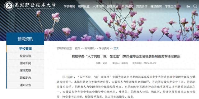 大皖新闻讯据芜湖职业技术大学官网消息:10月28日,“人才兴皖‘就’在江淮”安徽省装备制造类2026届高校毕业生省级系列就业招聘会在该校银湖校区举行。安徽省大中专毕业生就业指导中心尚承臣、叶世美,芜湖市人社局、鸠江区、经开区等负责同志赴该校指导,校党委书记田昕,校领导季慕寅、朱志国到场指导、服务。