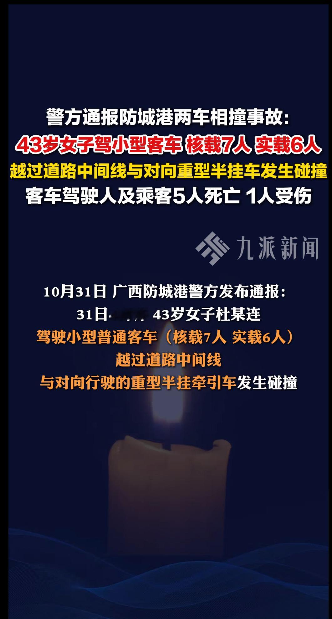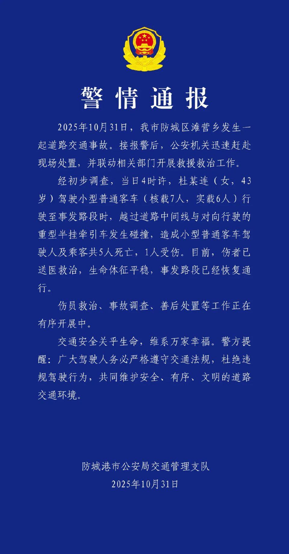 警方通报女子驾车撞上半挂致5死2025年10月31日凌晨4时许,防城港防城区乡道