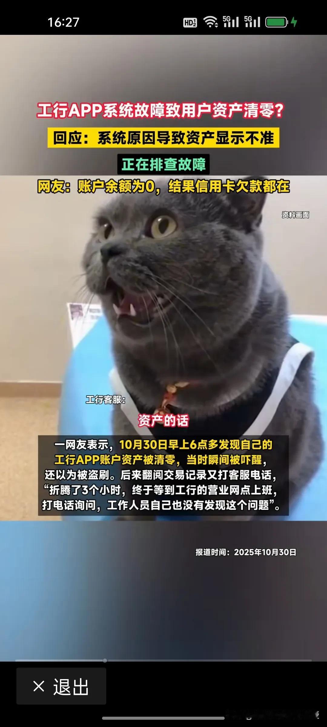 存款清零,贷款还在?工行APP系统今天故障导致不少客户资产为0,有网友早上起来看到自己资产一夜归零以为是遇到电信诈骗了。《凤凰财经》记者致电客服,说目前正在排查系统原因,今天的资产就不用参考了,显示不准。 这大概是第一次遇到工行有这样的情况,我刚特地查了一下,现在APP又恢复正常了。作为年投285亿科技费、坐拥3.6万技术人员的“宇宙行”,这样的系统故障确实不应该发生,老百姓可经不起这样资产瞬间“清零”的虚惊啊!