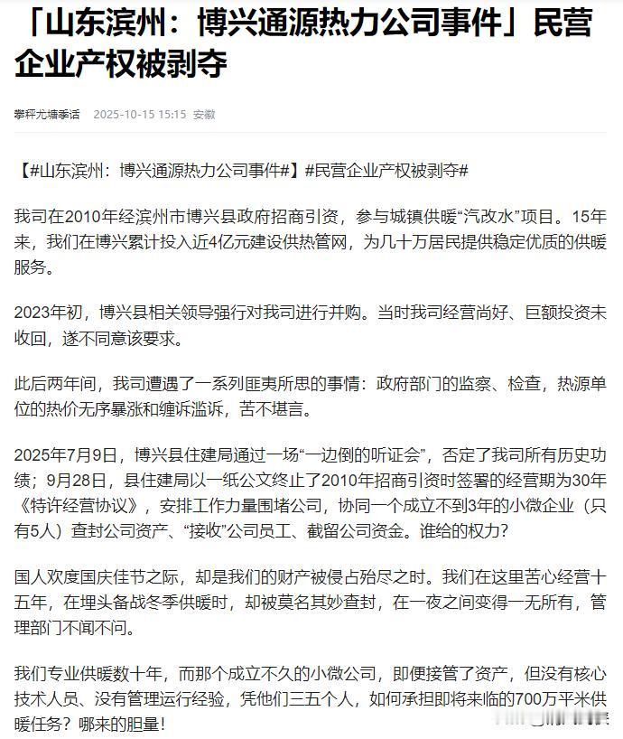 政府招商引资,解决民生问题 民企积极响应,十年成长不易! 缘何被接管?官媒发文表态。 据大象新闻记者采访消息: 2010年,通源集团通过招商引资入驻博兴县,成立博兴县通源、恒源两个热力公司。 2023年8月31日,博兴县住建局还发函评价通源公司“经过13个采暖期的运行,安全可靠、效果明显,解决了困扰我县多年的城区居民冬季供暖问题”。 2023年5月,博兴县住建局局长刘学刚找到公司负责人商量:“政府准备发行专项债进行融资,因为国家有规定,申报单位需持有效供热经营许可证,所以想借用我们公司的名义申报发债。”被企业拒绝。 过几天刘学刚提出由政府公共事业集团入股民企,未获同意。 5月10日,刘学刚再次来到公司,说政府公共事业集团准备收购我们公司,仍未获同意。 2023年6月12日,在住建局收到供热公司的复函后回复“将本着友好、共赢、互利互惠的原则,妥善解决新形势下城区供热问题”。 后续发展真的如住建局的答复所说那样吗?有媒体早在10.5日报道:“三板斧”落向民企。(图1) 第一式:通源、恒源公司为遭用户投诉供暖不达标问题承担责任。实际情况是服务满意率、供热达标率,高于国家对同行业的考核要求。 第二式:在热源价格上设置障碍,在新热源供应方国能博兴电厂未参会,县价格主管部门未参会的情况下,住建局提出每吉焦92元,违反《政府制定价格行为规则》的规定。 第三式:2025.9.29日,公安、特警人员、博兴县公用事业集团下属的博兴县恒通热力有限公司查封查扣恒源和通源。 10.15日,有自称通源通源热力公司员工针对此事在网上发文(图2)。 10.30日,经过大象新闻的采访和报道,引发网络热议,新京报官媒也发文声援(图3),提出“健全社会信用体系,政府应该带头守信践诺”、“用法治的力量给民营企业经营权和产权提供有效保障。” 民企投资数亿苦心经营十数年,政府机关有债券任务要完成,如何能够让双方都能“得偿所愿”,可能是一个比较复杂的问题。二十届四中全会通过的《中共中央关于制定国民经济和社会发展第十五个五年规划的建议》指出,落实民营经济促进法,从法律和制度上保障平等使用生产要素、公平参与市场竞争、有效保护合法权益,发展壮大民营经济。聚焦民营企业与民营企业家的权益保护问题。