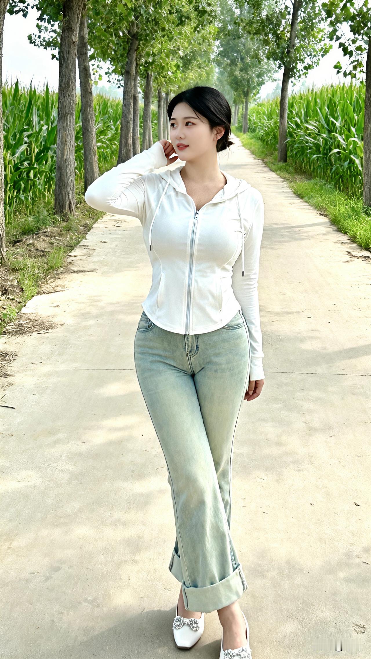 🌿 厌倦了城市喧嚣?来乡间小道get治愈系田园风穿搭! 走在两侧绿树成荫的水泥小道上,一旁是翠绿的玉米地,阳光透过树叶洒下光斑,这画面简直把“治愈”二字刻进骨子里~ 一身穿搭很有小心思:白色连帽拉链开衫简约又显质感,浅色系卷边阔腿牛仔裤随性还显腿长,搭配带饰小白鞋,在田园里也能穿出时尚感,曲线感拉满却又很保守得体~ 或坐或走,在乡间小道上享受片刻闲适,看着满眼绿意,所有的疲惫都被抚平了。这种把日子过成诗的田园时光,谁能不心动? 你平时爱往乡间跑吗?这样的田园风穿搭你打几分?👇女人怎样穿搭才减龄 你觉得农村的姑娘怎么样 简单穿,真的高级吗